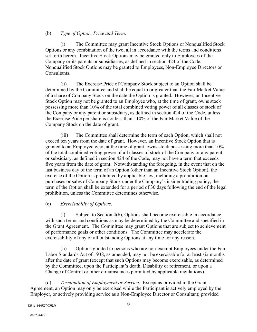 DB1/ 144570925.9 9 #852344v7 (b) Type of Option, Price and Term. (i) The Committee may grant Incentive Stock Options or Nonqualified Stock Options or any combination of the two, all in accordance with the terms and conditions set forth herein. Incentive Stock Options may be granted only to Employees of the Company or its parents or subsidiaries, as defined in section 424 of the Code. Nonqualified Stock Options may be granted to Employees, Non-Employee Directors or Consultants. (ii) The Exercise Price of Company Stock subject to an Option shall be determined by the Committee and shall be equal to or greater than the Fair Market Value of a share of Company Stock on the date the Option is granted. However, an Incentive Stock Option may not be granted to an Employee who, at the time of grant, owns stock possessing more than 10% of the total combined voting power of all classes of stock of the Company or any parent or subsidiary, as defined in section 424 of the Code, unless the Exercise Price per share is not less than 110% of the Fair Market Value of the Company Stock on the date of grant. (iii) The Committee shall determine the term of each Option, which shall not exceed ten years from the date of grant. However, an Incentive Stock Option that is granted to an Employee who, at the time of grant, owns stock possessing more than 10% of the total combined voting power of all classes of stock of the Company or any parent or subsidiary, as defined in section 424 of the Code, may not have a term that exceeds five years from the date of grant. Notwithstanding the foregoing, in the event that on the last business day of the term of an Option (other than an Incentive Stock Option), the exercise of the Option is prohibited by applicable law, including a prohibition on purchases or sales of Company Stock under the Company’s insider trading policy, the term of the Option shall be extended for a period of 30 days following the end of the legal prohibition, unless the Committee determines otherwise. (c) Exercisability of Options. (i) Subject to Section 4(b), Options shall become exercisable in accordance with such terms and conditions as may be determined by the Committee and specified in the Grant Agreement. The Committee may grant Options that are subject to achievement of performance goals or other conditions. The Committee may accelerate the exercisability of any or all outstanding Options at any time for any reason. (ii) Options granted to persons who are non-exempt Employees under the Fair Labor Standards Act of 1938, as amended, may not be exercisable for at least six months after the date of grant (except that such Options may become exercisable, as determined by the Committee, upon the Participant’s death, Disability or retirement, or upon a Change of Control or other circumstances permitted by applicable regulations). (d) Termination of Employment or Service. Except as provided in the Grant Agreement, an Option may only be exercised while the Participant is actively employed by the Employer, or actively providing service as a Non-Employee Director or Consultant; provided