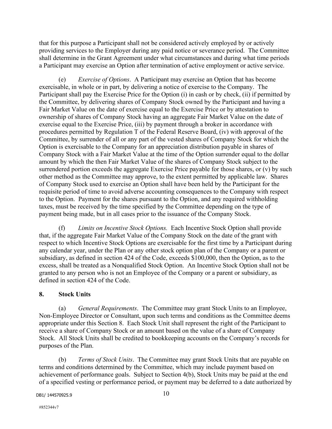 DB1/ 144570925.9 10 #852344v7 that for this purpose a Participant shall not be considered actively employed by or actively providing services to the Employer during any paid notice or severance period. The Committee shall determine in the Grant Agreement under what circumstances and during what time periods a Participant may exercise an Option after termination of active employment or active service. (e) Exercise of Options. A Participant may exercise an Option that has become exercisable, in whole or in part, by delivering a notice of exercise to the Company. The Participant shall pay the Exercise Price for the Option (i) in cash or by check, (ii) if permitted by the Committee, by delivering shares of Company Stock owned by the Participant and having a Fair Market Value on the date of exercise equal to the Exercise Price or by attestation to ownership of shares of Company Stock having an aggregate Fair Market Value on the date of exercise equal to the Exercise Price, (iii) by payment through a broker in accordance with procedures permitted by Regulation T of the Federal Reserve Board, (iv) with approval of the Committee, by surrender of all or any part of the vested shares of Company Stock for which the Option is exercisable to the Company for an appreciation distribution payable in shares of Company Stock with a Fair Market Value at the time of the Option surrender equal to the dollar amount by which the then Fair Market Value of the shares of Company Stock subject to the surrendered portion exceeds the aggregate Exercise Price payable for those shares, or (v) by such other method as the Committee may approve, to the extent permitted by applicable law. Shares of Company Stock used to exercise an Option shall have been held by the Participant for the requisite period of time to avoid adverse accounting consequences to the Company with respect to the Option. Payment for the shares pursuant to the Option, and any required withholding taxes, must be received by the time specified by the Committee depending on the type of payment being made, but in all cases prior to the issuance of the Company Stock. (f) Limits on Incentive Stock Options. Each Incentive Stock Option shall provide that, if the aggregate Fair Market Value of the Company Stock on the date of the grant with respect to which Incentive Stock Options are exercisable for the first time by a Participant during any calendar year, under the Plan or any other stock option plan of the Company or a parent or subsidiary, as defined in section 424 of the Code, exceeds $100,000, then the Option, as to the excess, shall be treated as a Nonqualified Stock Option. An Incentive Stock Option shall not be granted to any person who is not an Employee of the Company or a parent or subsidiary, as defined in section 424 of the Code. 8. Stock Units (a) General Requirements. The Committee may grant Stock Units to an Employee, Non-Employee Director or Consultant, upon such terms and conditions as the Committee deems appropriate under this Section 8. Each Stock Unit shall represent the right of the Participant to receive a share of Company Stock or an amount based on the value of a share of Company Stock. All Stock Units shall be credited to bookkeeping accounts on the Company’s records for purposes of the Plan. (b) Terms of Stock Units. The Committee may grant Stock Units that are payable on terms and conditions determined by the Committee, which may include payment based on achievement of performance goals. Subject to Section 4(b), Stock Units may be paid at the end of a specified vesting or performance period, or payment may be deferred to a date authorized by