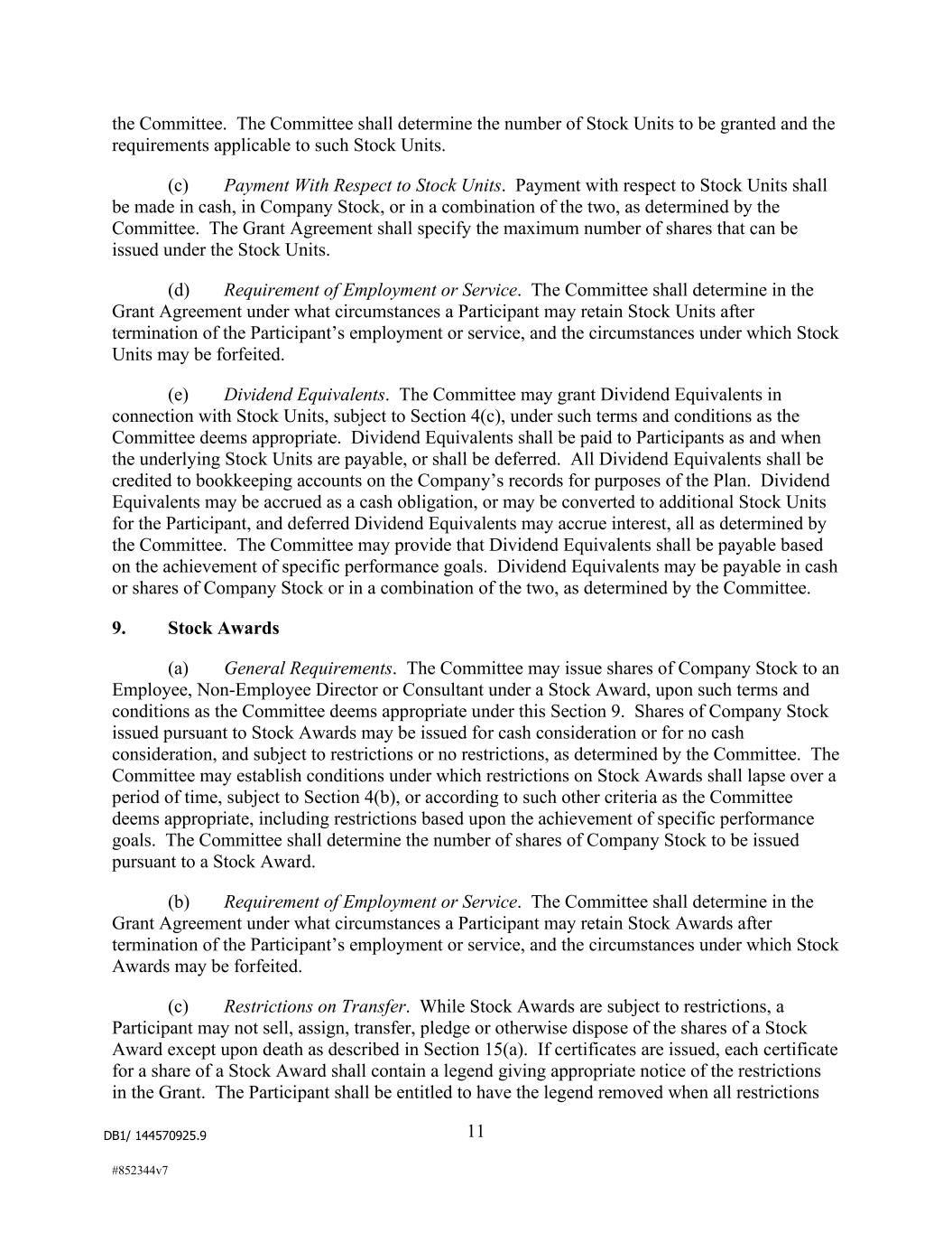 DB1/ 144570925.9 11 #852344v7 the Committee. The Committee shall determine the number of Stock Units to be granted and the requirements applicable to such Stock Units. (c) Payment With Respect to Stock Units. Payment with respect to Stock Units shall be made in cash, in Company Stock, or in a combination of the two, as determined by the Committee. The Grant Agreement shall specify the maximum number of shares that can be issued under the Stock Units. (d) Requirement of Employment or Service. The Committee shall determine in the Grant Agreement under what circumstances a Participant may retain Stock Units after termination of the Participant’s employment or service, and the circumstances under which Stock Units may be forfeited. (e) Dividend Equivalents. The Committee may grant Dividend Equivalents in connection with Stock Units, subject to Section 4(c), under such terms and conditions as the Committee deems appropriate. Dividend Equivalents shall be paid to Participants as and when the underlying Stock Units are payable, or shall be deferred. All Dividend Equivalents shall be credited to bookkeeping accounts on the Company’s records for purposes of the Plan. Dividend Equivalents may be accrued as a cash obligation, or may be converted to additional Stock Units for the Participant, and deferred Dividend Equivalents may accrue interest, all as determined by the Committee. The Committee may provide that Dividend Equivalents shall be payable based on the achievement of specific performance goals. Dividend Equivalents may be payable in cash or shares of Company Stock or in a combination of the two, as determined by the Committee. 9. Stock Awards (a) General Requirements. The Committee may issue shares of Company Stock to an Employee, Non-Employee Director or Consultant under a Stock Award, upon such terms and conditions as the Committee deems appropriate under this Section 9. Shares of Company Stock issued pursuant to Stock Awards may be issued for cash consideration or for no cash consideration, and subject to restrictions or no restrictions, as determined by the Committee. The Committee may establish conditions under which restrictions on Stock Awards shall lapse over a period of time, subject to Section 4(b), or according to such other criteria as the Committee deems appropriate, including restrictions based upon the achievement of specific performance goals. The Committee shall determine the number of shares of Company Stock to be issued pursuant to a Stock Award. (b) Requirement of Employment or Service. The Committee shall determine in the Grant Agreement under what circumstances a Participant may retain Stock Awards after termination of the Participant’s employment or service, and the circumstances under which Stock Awards may be forfeited. (c) Restrictions on Transfer. While Stock Awards are subject to restrictions, a Participant may not sell, assign, transfer, pledge or otherwise dispose of the shares of a Stock Award except upon death as described in Section 15(a). If certificates are issued, each certificate for a share of a Stock Award shall contain a legend giving appropriate notice of the restrictions in the Grant. The Participant shall be entitled to have the legend removed when all restrictions