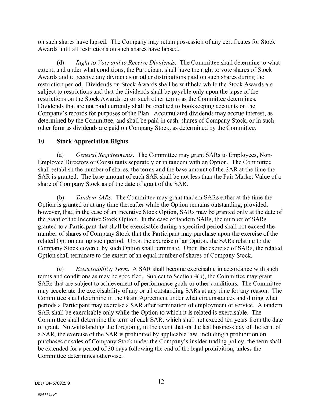 DB1/ 144570925.9 12 #852344v7 on such shares have lapsed. The Company may retain possession of any certificates for Stock Awards until all restrictions on such shares have lapsed. (d) Right to Vote and to Receive Dividends. The Committee shall determine to what extent, and under what conditions, the Participant shall have the right to vote shares of Stock Awards and to receive any dividends or other distributions paid on such shares during the restriction period. Dividends on Stock Awards shall be withheld while the Stock Awards are subject to restrictions and that the dividends shall be payable only upon the lapse of the restrictions on the Stock Awards, or on such other terms as the Committee determines. Dividends that are not paid currently shall be credited to bookkeeping accounts on the Company’s records for purposes of the Plan. Accumulated dividends may accrue interest, as determined by the Committee, and shall be paid in cash, shares of Company Stock, or in such other form as dividends are paid on Company Stock, as determined by the Committee. 10. Stock Appreciation Rights (a) General Requirements. The Committee may grant SARs to Employees, Non- Employee Directors or Consultants separately or in tandem with an Option. The Committee shall establish the number of shares, the terms and the base amount of the SAR at the time the SAR is granted. The base amount of each SAR shall be not less than the Fair Market Value of a share of Company Stock as of the date of grant of the SAR. (b) Tandem SARs. The Committee may grant tandem SARs either at the time the Option is granted or at any time thereafter while the Option remains outstanding; provided, however, that, in the case of an Incentive Stock Option, SARs may be granted only at the date of the grant of the Incentive Stock Option. In the case of tandem SARs, the number of SARs granted to a Participant that shall be exercisable during a specified period shall not exceed the number of shares of Company Stock that the Participant may purchase upon the exercise of the related Option during such period. Upon the exercise of an Option, the SARs relating to the Company Stock covered by such Option shall terminate. Upon the exercise of SARs, the related Option shall terminate to the extent of an equal number of shares of Company Stock. (c) Exercisability; Term. A SAR shall become exercisable in accordance with such terms and conditions as may be specified. Subject to Section 4(b), the Committee may grant SARs that are subject to achievement of performance goals or other conditions. The Committee may accelerate the exercisability of any or all outstanding SARs at any time for any reason. The Committee shall determine in the Grant Agreement under what circumstances and during what periods a Participant may exercise a SAR after termination of employment or service. A tandem SAR shall be exercisable only while the Option to which it is related is exercisable. The Committee shall determine the term of each SAR, which shall not exceed ten years from the date of grant. Notwithstanding the foregoing, in the event that on the last business day of the term of a SAR, the exercise of the SAR is prohibited by applicable law, including a prohibition on purchases or sales of Company Stock under the Company’s insider trading policy, the term shall be extended for a period of 30 days following the end of the legal prohibition, unless the Committee determines otherwise.
