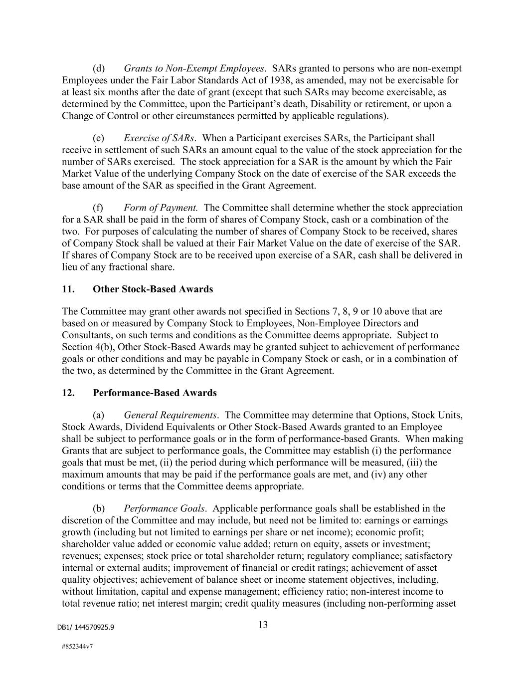 DB1/ 144570925.9 13 #852344v7 (d) Grants to Non-Exempt Employees. SARs granted to persons who are non-exempt Employees under the Fair Labor Standards Act of 1938, as amended, may not be exercisable for at least six months after the date of grant (except that such SARs may become exercisable, as determined by the Committee, upon the Participant’s death, Disability or retirement, or upon a Change of Control or other circumstances permitted by applicable regulations). (e) Exercise of SARs. When a Participant exercises SARs, the Participant shall receive in settlement of such SARs an amount equal to the value of the stock appreciation for the number of SARs exercised. The stock appreciation for a SAR is the amount by which the Fair Market Value of the underlying Company Stock on the date of exercise of the SAR exceeds the base amount of the SAR as specified in the Grant Agreement. (f) Form of Payment. The Committee shall determine whether the stock appreciation for a SAR shall be paid in the form of shares of Company Stock, cash or a combination of the two. For purposes of calculating the number of shares of Company Stock to be received, shares of Company Stock shall be valued at their Fair Market Value on the date of exercise of the SAR. If shares of Company Stock are to be received upon exercise of a SAR, cash shall be delivered in lieu of any fractional share. 11. Other Stock-Based Awards The Committee may grant other awards not specified in Sections 7, 8, 9 or 10 above that are based on or measured by Company Stock to Employees, Non-Employee Directors and Consultants, on such terms and conditions as the Committee deems appropriate. Subject to Section 4(b), Other Stock-Based Awards may be granted subject to achievement of performance goals or other conditions and may be payable in Company Stock or cash, or in a combination of the two, as determined by the Committee in the Grant Agreement. 12. Performance-Based Awards (a) General Requirements. The Committee may determine that Options, Stock Units, Stock Awards, Dividend Equivalents or Other Stock-Based Awards granted to an Employee shall be subject to performance goals or in the form of performance-based Grants. When making Grants that are subject to performance goals, the Committee may establish (i) the performance goals that must be met, (ii) the period during which performance will be measured, (iii) the maximum amounts that may be paid if the performance goals are met, and (iv) any other conditions or terms that the Committee deems appropriate. (b) Performance Goals. Applicable performance goals shall be established in the discretion of the Committee and may include, but need not be limited to: earnings or earnings growth (including but not limited to earnings per share or net income); economic profit; shareholder value added or economic value added; return on equity, assets or investment; revenues; expenses; stock price or total shareholder return; regulatory compliance; satisfactory internal or external audits; improvement of financial or credit ratings; achievement of asset quality objectives; achievement of balance sheet or income statement objectives, including, without limitation, capital and expense management; efficiency ratio; non-interest income to total revenue ratio; net interest margin; credit quality measures (including non-performing asset
