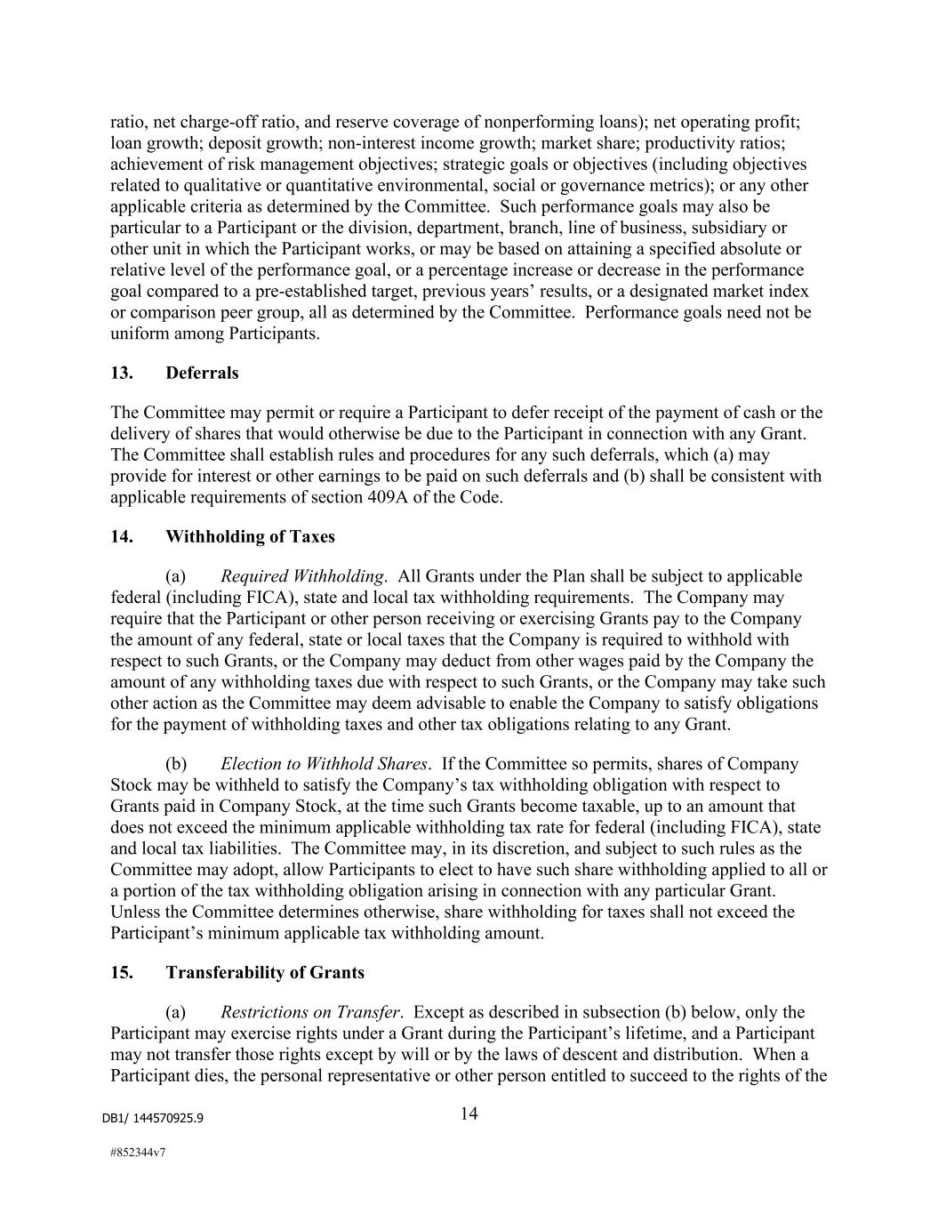 DB1/ 144570925.9 14 #852344v7 ratio, net charge-off ratio, and reserve coverage of nonperforming loans); net operating profit; loan growth; deposit growth; non-interest income growth; market share; productivity ratios; achievement of risk management objectives; strategic goals or objectives (including objectives related to qualitative or quantitative environmental, social or governance metrics); or any other applicable criteria as determined by the Committee. Such performance goals may also be particular to a Participant or the division, department, branch, line of business, subsidiary or other unit in which the Participant works, or may be based on attaining a specified absolute or relative level of the performance goal, or a percentage increase or decrease in the performance goal compared to a pre-established target, previous years’ results, or a designated market index or comparison peer group, all as determined by the Committee. Performance goals need not be uniform among Participants. 13. Deferrals The Committee may permit or require a Participant to defer receipt of the payment of cash or the delivery of shares that would otherwise be due to the Participant in connection with any Grant. The Committee shall establish rules and procedures for any such deferrals, which (a) may provide for interest or other earnings to be paid on such deferrals and (b) shall be consistent with applicable requirements of section 409A of the Code. 14. Withholding of Taxes (a) Required Withholding. All Grants under the Plan shall be subject to applicable federal (including FICA), state and local tax withholding requirements. The Company may require that the Participant or other person receiving or exercising Grants pay to the Company the amount of any federal, state or local taxes that the Company is required to withhold with respect to such Grants, or the Company may deduct from other wages paid by the Company the amount of any withholding taxes due with respect to such Grants, or the Company may take such other action as the Committee may deem advisable to enable the Company to satisfy obligations for the payment of withholding taxes and other tax obligations relating to any Grant. (b) Election to Withhold Shares. If the Committee so permits, shares of Company Stock may be withheld to satisfy the Company’s tax withholding obligation with respect to Grants paid in Company Stock, at the time such Grants become taxable, up to an amount that does not exceed the minimum applicable withholding tax rate for federal (including FICA), state and local tax liabilities. The Committee may, in its discretion, and subject to such rules as the Committee may adopt, allow Participants to elect to have such share withholding applied to all or a portion of the tax withholding obligation arising in connection with any particular Grant. Unless the Committee determines otherwise, share withholding for taxes shall not exceed the Participant’s minimum applicable tax withholding amount. 15. Transferability of Grants (a) Restrictions on Transfer. Except as described in subsection (b) below, only the Participant may exercise rights under a Grant during the Participant’s lifetime, and a Participant may not transfer those rights except by will or by the laws of descent and distribution. When a Participant dies, the personal representative or other person entitled to succeed to the rights of the
