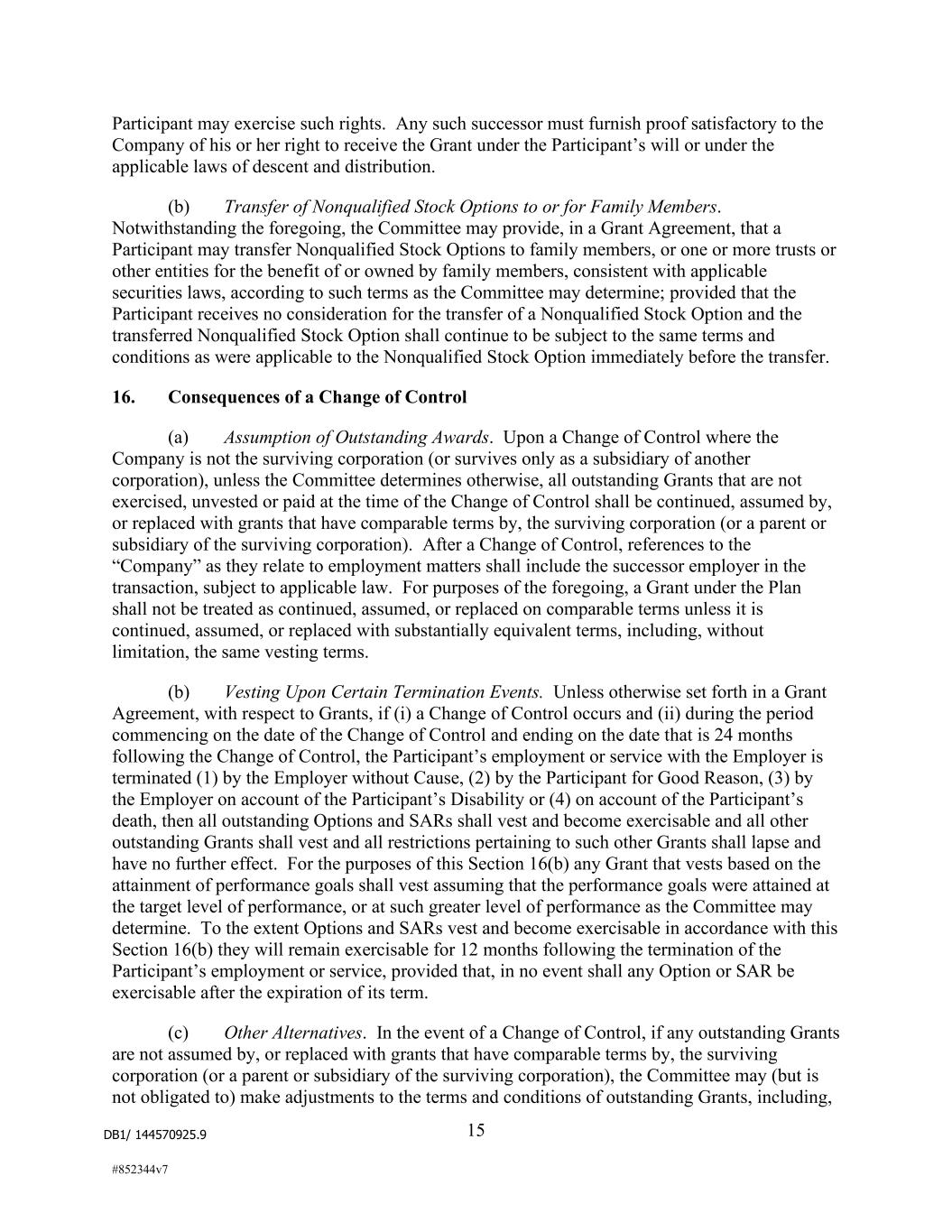 DB1/ 144570925.9 15 #852344v7 Participant may exercise such rights. Any such successor must furnish proof satisfactory to the Company of his or her right to receive the Grant under the Participant’s will or under the applicable laws of descent and distribution. (b) Transfer of Nonqualified Stock Options to or for Family Members. Notwithstanding the foregoing, the Committee may provide, in a Grant Agreement, that a Participant may transfer Nonqualified Stock Options to family members, or one or more trusts or other entities for the benefit of or owned by family members, consistent with applicable securities laws, according to such terms as the Committee may determine; provided that the Participant receives no consideration for the transfer of a Nonqualified Stock Option and the transferred Nonqualified Stock Option shall continue to be subject to the same terms and conditions as were applicable to the Nonqualified Stock Option immediately before the transfer. 16. Consequences of a Change of Control (a) Assumption of Outstanding Awards. Upon a Change of Control where the Company is not the surviving corporation (or survives only as a subsidiary of another corporation), unless the Committee determines otherwise, all outstanding Grants that are not exercised, unvested or paid at the time of the Change of Control shall be continued, assumed by, or replaced with grants that have comparable terms by, the surviving corporation (or a parent or subsidiary of the surviving corporation). After a Change of Control, references to the “Company” as they relate to employment matters shall include the successor employer in the transaction, subject to applicable law. For purposes of the foregoing, a Grant under the Plan shall not be treated as continued, assumed, or replaced on comparable terms unless it is continued, assumed, or replaced with substantially equivalent terms, including, without limitation, the same vesting terms. (b) Vesting Upon Certain Termination Events. Unless otherwise set forth in a Grant Agreement, with respect to Grants, if (i) a Change of Control occurs and (ii) during the period commencing on the date of the Change of Control and ending on the date that is 24 months following the Change of Control, the Participant’s employment or service with the Employer is terminated (1) by the Employer without Cause, (2) by the Participant for Good Reason, (3) by the Employer on account of the Participant’s Disability or (4) on account of the Participant’s death, then all outstanding Options and SARs shall vest and become exercisable and all other outstanding Grants shall vest and all restrictions pertaining to such other Grants shall lapse and have no further effect. For the purposes of this Section 16(b) any Grant that vests based on the attainment of performance goals shall vest assuming that the performance goals were attained at the target level of performance, or at such greater level of performance as the Committee may determine. To the extent Options and SARs vest and become exercisable in accordance with this Section 16(b) they will remain exercisable for 12 months following the termination of the Participant’s employment or service, provided that, in no event shall any Option or SAR be exercisable after the expiration of its term. (c) Other Alternatives. In the event of a Change of Control, if any outstanding Grants are not assumed by, or replaced with grants that have comparable terms by, the surviving corporation (or a parent or subsidiary of the surviving corporation), the Committee may (but is not obligated to) make adjustments to the terms and conditions of outstanding Grants, including,