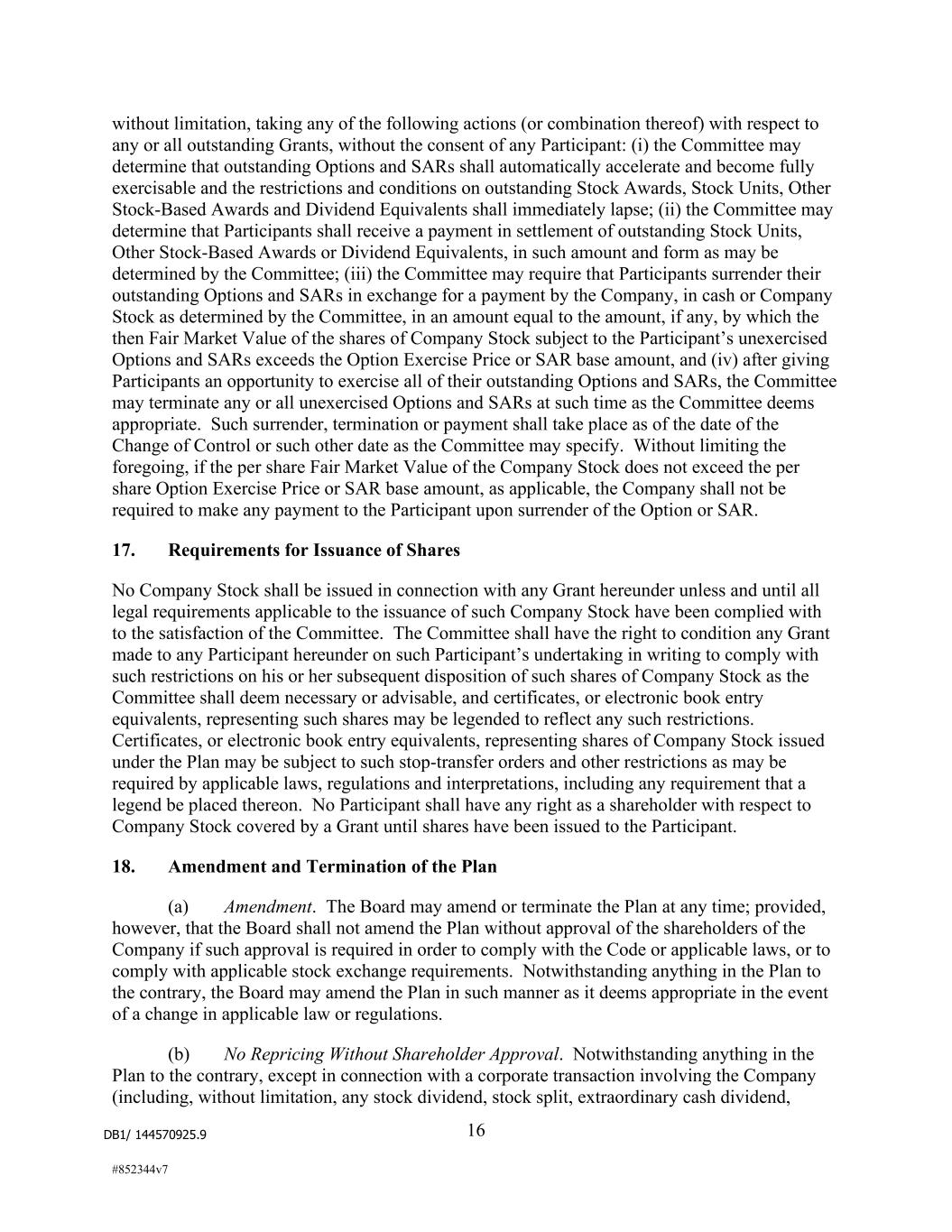 DB1/ 144570925.9 16 #852344v7 without limitation, taking any of the following actions (or combination thereof) with respect to any or all outstanding Grants, without the consent of any Participant: (i) the Committee may determine that outstanding Options and SARs shall automatically accelerate and become fully exercisable and the restrictions and conditions on outstanding Stock Awards, Stock Units, Other Stock-Based Awards and Dividend Equivalents shall immediately lapse; (ii) the Committee may determine that Participants shall receive a payment in settlement of outstanding Stock Units, Other Stock-Based Awards or Dividend Equivalents, in such amount and form as may be determined by the Committee; (iii) the Committee may require that Participants surrender their outstanding Options and SARs in exchange for a payment by the Company, in cash or Company Stock as determined by the Committee, in an amount equal to the amount, if any, by which the then Fair Market Value of the shares of Company Stock subject to the Participant’s unexercised Options and SARs exceeds the Option Exercise Price or SAR base amount, and (iv) after giving Participants an opportunity to exercise all of their outstanding Options and SARs, the Committee may terminate any or all unexercised Options and SARs at such time as the Committee deems appropriate. Such surrender, termination or payment shall take place as of the date of the Change of Control or such other date as the Committee may specify. Without limiting the foregoing, if the per share Fair Market Value of the Company Stock does not exceed the per share Option Exercise Price or SAR base amount, as applicable, the Company shall not be required to make any payment to the Participant upon surrender of the Option or SAR. 17. Requirements for Issuance of Shares No Company Stock shall be issued in connection with any Grant hereunder unless and until all legal requirements applicable to the issuance of such Company Stock have been complied with to the satisfaction of the Committee. The Committee shall have the right to condition any Grant made to any Participant hereunder on such Participant’s undertaking in writing to comply with such restrictions on his or her subsequent disposition of such shares of Company Stock as the Committee shall deem necessary or advisable, and certificates, or electronic book entry equivalents, representing such shares may be legended to reflect any such restrictions. Certificates, or electronic book entry equivalents, representing shares of Company Stock issued under the Plan may be subject to such stop-transfer orders and other restrictions as may be required by applicable laws, regulations and interpretations, including any requirement that a legend be placed thereon. No Participant shall have any right as a shareholder with respect to Company Stock covered by a Grant until shares have been issued to the Participant. 18. Amendment and Termination of the Plan (a) Amendment. The Board may amend or terminate the Plan at any time; provided, however, that the Board shall not amend the Plan without approval of the shareholders of the Company if such approval is required in order to comply with the Code or applicable laws, or to comply with applicable stock exchange requirements. Notwithstanding anything in the Plan to the contrary, the Board may amend the Plan in such manner as it deems appropriate in the event of a change in applicable law or regulations. (b) No Repricing Without Shareholder Approval. Notwithstanding anything in the Plan to the contrary, except in connection with a corporate transaction involving the Company (including, without limitation, any stock dividend, stock split, extraordinary cash dividend,