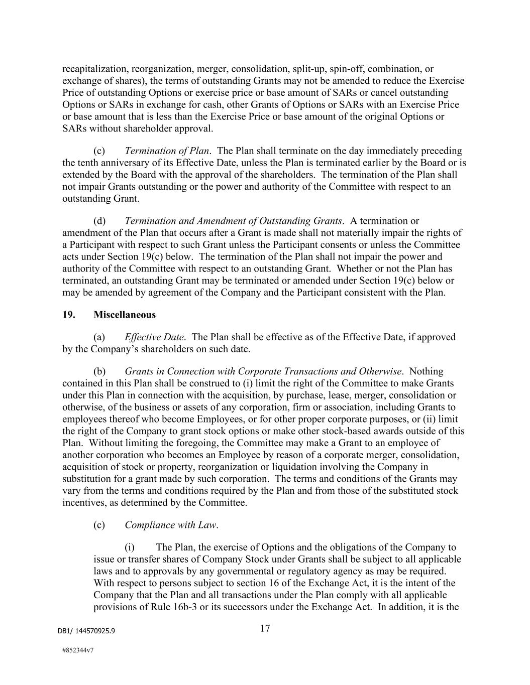 DB1/ 144570925.9 17 #852344v7 recapitalization, reorganization, merger, consolidation, split-up, spin-off, combination, or exchange of shares), the terms of outstanding Grants may not be amended to reduce the Exercise Price of outstanding Options or exercise price or base amount of SARs or cancel outstanding Options or SARs in exchange for cash, other Grants of Options or SARs with an Exercise Price or base amount that is less than the Exercise Price or base amount of the original Options or SARs without shareholder approval. (c) Termination of Plan. The Plan shall terminate on the day immediately preceding the tenth anniversary of its Effective Date, unless the Plan is terminated earlier by the Board or is extended by the Board with the approval of the shareholders. The termination of the Plan shall not impair Grants outstanding or the power and authority of the Committee with respect to an outstanding Grant. (d) Termination and Amendment of Outstanding Grants. A termination or amendment of the Plan that occurs after a Grant is made shall not materially impair the rights of a Participant with respect to such Grant unless the Participant consents or unless the Committee acts under Section 19(c) below. The termination of the Plan shall not impair the power and authority of the Committee with respect to an outstanding Grant. Whether or not the Plan has terminated, an outstanding Grant may be terminated or amended under Section 19(c) below or may be amended by agreement of the Company and the Participant consistent with the Plan. 19. Miscellaneous (a) Effective Date. The Plan shall be effective as of the Effective Date, if approved by the Company’s shareholders on such date. (b) Grants in Connection with Corporate Transactions and Otherwise. Nothing contained in this Plan shall be construed to (i) limit the right of the Committee to make Grants under this Plan in connection with the acquisition, by purchase, lease, merger, consolidation or otherwise, of the business or assets of any corporation, firm or association, including Grants to employees thereof who become Employees, or for other proper corporate purposes, or (ii) limit the right of the Company to grant stock options or make other stock-based awards outside of this Plan. Without limiting the foregoing, the Committee may make a Grant to an employee of another corporation who becomes an Employee by reason of a corporate merger, consolidation, acquisition of stock or property, reorganization or liquidation involving the Company in substitution for a grant made by such corporation. The terms and conditions of the Grants may vary from the terms and conditions required by the Plan and from those of the substituted stock incentives, as determined by the Committee. (c) Compliance with Law. (i) The Plan, the exercise of Options and the obligations of the Company to issue or transfer shares of Company Stock under Grants shall be subject to all applicable laws and to approvals by any governmental or regulatory agency as may be required. With respect to persons subject to section 16 of the Exchange Act, it is the intent of the Company that the Plan and all transactions under the Plan comply with all applicable provisions of Rule 16b-3 or its successors under the Exchange Act. In addition, it is the