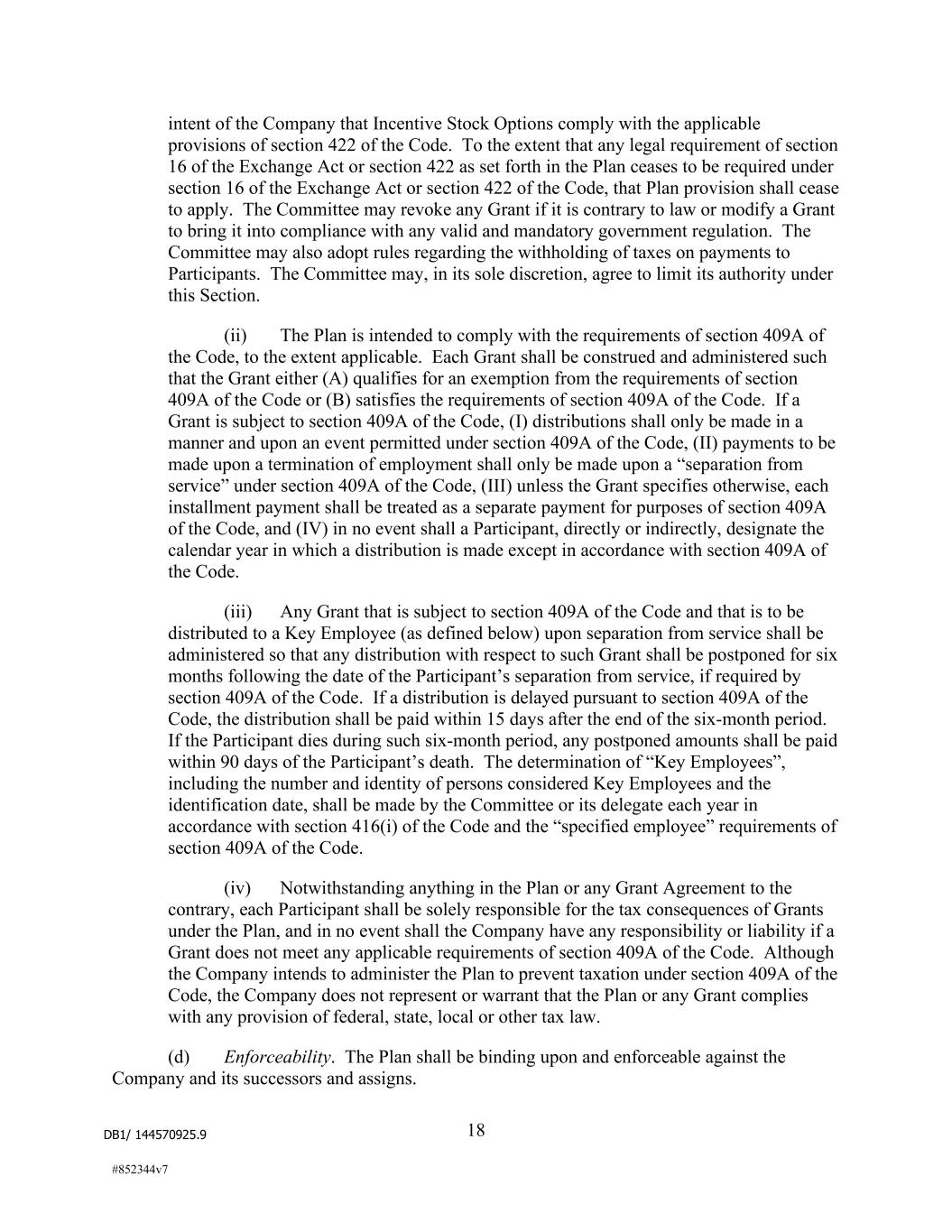 DB1/ 144570925.9 18 #852344v7 intent of the Company that Incentive Stock Options comply with the applicable provisions of section 422 of the Code. To the extent that any legal requirement of section 16 of the Exchange Act or section 422 as set forth in the Plan ceases to be required under section 16 of the Exchange Act or section 422 of the Code, that Plan provision shall cease to apply. The Committee may revoke any Grant if it is contrary to law or modify a Grant to bring it into compliance with any valid and mandatory government regulation. The Committee may also adopt rules regarding the withholding of taxes on payments to Participants. The Committee may, in its sole discretion, agree to limit its authority under this Section. (ii) The Plan is intended to comply with the requirements of section 409A of the Code, to the extent applicable. Each Grant shall be construed and administered such that the Grant either (A) qualifies for an exemption from the requirements of section 409A of the Code or (B) satisfies the requirements of section 409A of the Code. If a Grant is subject to section 409A of the Code, (I) distributions shall only be made in a manner and upon an event permitted under section 409A of the Code, (II) payments to be made upon a termination of employment shall only be made upon a “separation from service” under section 409A of the Code, (III) unless the Grant specifies otherwise, each installment payment shall be treated as a separate payment for purposes of section 409A of the Code, and (IV) in no event shall a Participant, directly or indirectly, designate the calendar year in which a distribution is made except in accordance with section 409A of the Code. (iii) Any Grant that is subject to section 409A of the Code and that is to be distributed to a Key Employee (as defined below) upon separation from service shall be administered so that any distribution with respect to such Grant shall be postponed for six months following the date of the Participant’s separation from service, if required by section 409A of the Code. If a distribution is delayed pursuant to section 409A of the Code, the distribution shall be paid within 15 days after the end of the six-month period. If the Participant dies during such six-month period, any postponed amounts shall be paid within 90 days of the Participant’s death. The determination of “Key Employees”, including the number and identity of persons considered Key Employees and the identification date, shall be made by the Committee or its delegate each year in accordance with section 416(i) of the Code and the “specified employee” requirements of section 409A of the Code. (iv) Notwithstanding anything in the Plan or any Grant Agreement to the contrary, each Participant shall be solely responsible for the tax consequences of Grants under the Plan, and in no event shall the Company have any responsibility or liability if a Grant does not meet any applicable requirements of section 409A of the Code. Although the Company intends to administer the Plan to prevent taxation under section 409A of the Code, the Company does not represent or warrant that the Plan or any Grant complies with any provision of federal, state, local or other tax law. (d) Enforceability. The Plan shall be binding upon and enforceable against the Company and its successors and assigns.