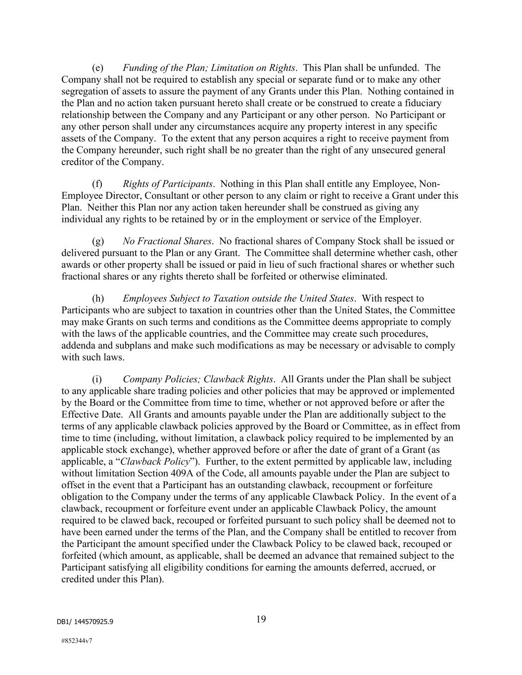 DB1/ 144570925.9 19 #852344v7 (e) Funding of the Plan; Limitation on Rights. This Plan shall be unfunded. The Company shall not be required to establish any special or separate fund or to make any other segregation of assets to assure the payment of any Grants under this Plan. Nothing contained in the Plan and no action taken pursuant hereto shall create or be construed to create a fiduciary relationship between the Company and any Participant or any other person. No Participant or any other person shall under any circumstances acquire any property interest in any specific assets of the Company. To the extent that any person acquires a right to receive payment from the Company hereunder, such right shall be no greater than the right of any unsecured general creditor of the Company. (f) Rights of Participants. Nothing in this Plan shall entitle any Employee, Non- Employee Director, Consultant or other person to any claim or right to receive a Grant under this Plan. Neither this Plan nor any action taken hereunder shall be construed as giving any individual any rights to be retained by or in the employment or service of the Employer. (g) No Fractional Shares. No fractional shares of Company Stock shall be issued or delivered pursuant to the Plan or any Grant. The Committee shall determine whether cash, other awards or other property shall be issued or paid in lieu of such fractional shares or whether such fractional shares or any rights thereto shall be forfeited or otherwise eliminated. (h) Employees Subject to Taxation outside the United States. With respect to Participants who are subject to taxation in countries other than the United States, the Committee may make Grants on such terms and conditions as the Committee deems appropriate to comply with the laws of the applicable countries, and the Committee may create such procedures, addenda and subplans and make such modifications as may be necessary or advisable to comply with such laws. (i) Company Policies; Clawback Rights. All Grants under the Plan shall be subject to any applicable share trading policies and other policies that may be approved or implemented by the Board or the Committee from time to time, whether or not approved before or after the Effective Date. All Grants and amounts payable under the Plan are additionally subject to the terms of any applicable clawback policies approved by the Board or Committee, as in effect from time to time (including, without limitation, a clawback policy required to be implemented by an applicable stock exchange), whether approved before or after the date of grant of a Grant (as applicable, a “Clawback Policy”). Further, to the extent permitted by applicable law, including without limitation Section 409A of the Code, all amounts payable under the Plan are subject to offset in the event that a Participant has an outstanding clawback, recoupment or forfeiture obligation to the Company under the terms of any applicable Clawback Policy. In the event of a clawback, recoupment or forfeiture event under an applicable Clawback Policy, the amount required to be clawed back, recouped or forfeited pursuant to such policy shall be deemed not to have been earned under the terms of the Plan, and the Company shall be entitled to recover from the Participant the amount specified under the Clawback Policy to be clawed back, recouped or forfeited (which amount, as applicable, shall be deemed an advance that remained subject to the Participant satisfying all eligibility conditions for earning the amounts deferred, accrued, or credited under this Plan).