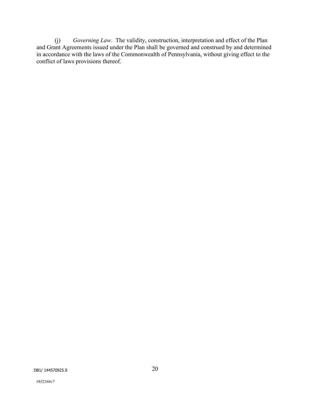DB1/ 144570925.9 20 #852344v7 (j) Governing Law. The validity, construction, interpretation and effect of the Plan and Grant Agreements issued under the Plan shall be governed and construed by and determined in accordance with the laws of the Commonwealth of Pennsylvania, without giving effect to the conflict of laws provisions thereof.