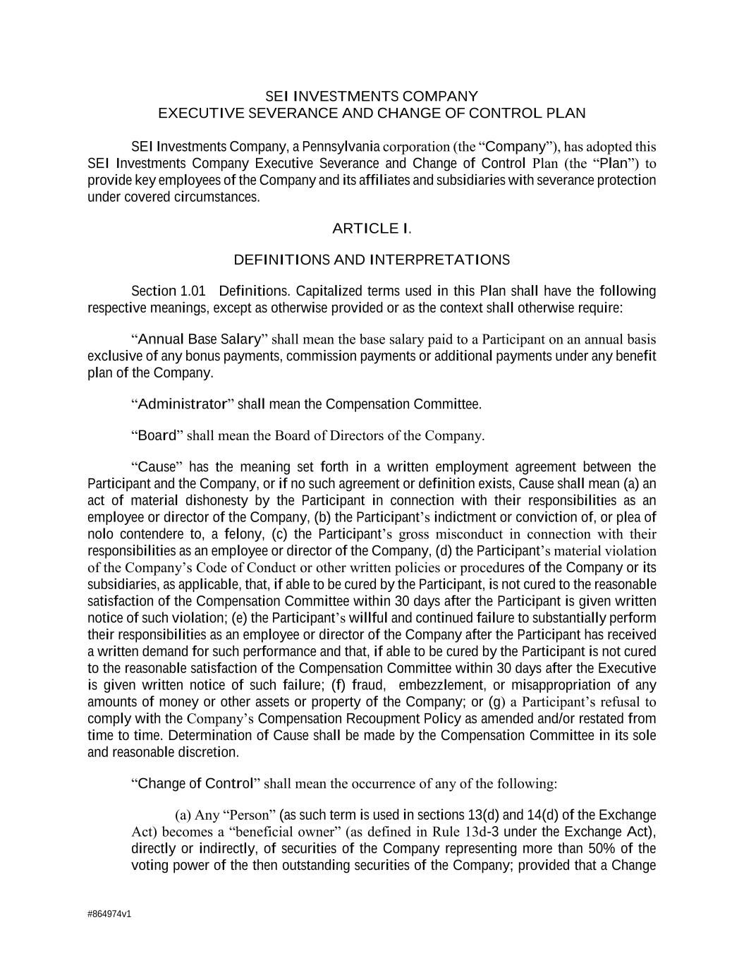 #864974v1 SEI INVESTMENTS COMPANY EXECUTIVE SEVERANCE AND CHANGE OF CONTROL PLAN SEI Investments Company, a Pennsylvania corporation (the “Company”), has adopted this SEI Investments Company Executive Severance and Change of Control Plan (the “Plan”) to provide key employees of the Company and its affiliates and subsidiaries with severance protection under covered circumstances. ARTICLE I. DEFINITIONS AND INTERPRETATIONS Section 1.01 Definitions. Capitalized terms used in this Plan shall have the following respective meanings, except as otherwise provided or as the context shall otherwise require: “Annual Base Salary” shall mean the base salary paid to a Participant on an annual basis exclusive of any bonus payments, commission payments or additional payments under any benefit plan of the Company. “Administrator” shall mean the Compensation Committee. “Board” shall mean the Board of Directors of the Company. “Cause” has the meaning set forth in a written employment agreement between the Participant and the Company, or if no such agreement or definition exists, Cause shall mean (a) an act of material dishonesty by the Participant in connection with their responsibilities as an employee or director of the Company, (b) the Participant’s indictment or conviction of, or plea of nolo contendere to, a felony, (c) the Participant’s gross misconduct in connection with their responsibilities as an employee or director of the Company, (d) the Participant’s material violation of the Company’s Code of Conduct or other written policies or procedures of the Company or its subsidiaries, as applicable, that, if able to be cured by the Participant, is not cured to the reasonable satisfaction of the Compensation Committee within 30 days after the Participant is given written notice of such violation; (e) the Participant’s willful and continued failure to substantially perform their responsibilities as an employee or director of the Company after the Participant has received a written demand for such performance and that, if able to be cured by the Participant is not cured to the reasonable satisfaction of the Compensation Committee within 30 days after the Executive is given written notice of such failure; (f) fraud, embezzlement, or misappropriation of any amounts of money or other assets or property of the Company; or (g) a Participant’s refusal to comply with the Company’s Compensation Recoupment Policy as amended and/or restated from time to time. Determination of Cause shall be made by the Compensation Committee in its sole and reasonable discretion. “Change of Control” shall mean the occurrence of any of the following: (a) Any “Person” (as such term is used in sections 13(d) and 14(d) of the Exchange Act) becomes a “beneficial owner” (as defined in Rule 13d-3 under the Exchange Act), directly or indirectly, of securities of the Company representing more than 50% of the voting power of the then outstanding securities of the Company; provided that a Change