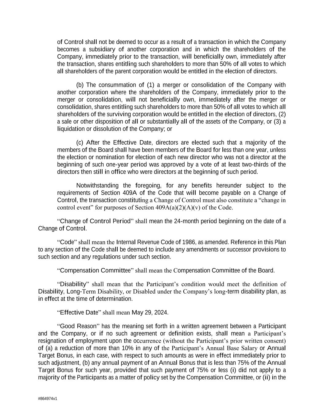 #864974v1 of Control shall not be deemed to occur as a result of a transaction in which the Company becomes a subsidiary of another corporation and in which the shareholders of the Company, immediately prior to the transaction, will beneficially own, immediately after the transaction, shares entitling such shareholders to more than 50% of all votes to which all shareholders of the parent corporation would be entitled in the election of directors. (b) The consummation of (1) a merger or consolidation of the Company with another corporation where the shareholders of the Company, immediately prior to the merger or consolidation, will not beneficially own, immediately after the merger or consolidation, shares entitling such shareholders to more than 50% of all votes to which all shareholders of the surviving corporation would be entitled in the election of directors, (2) a sale or other disposition of all or substantially all of the assets of the Company, or (3) a liquidation or dissolution of the Company; or (c) After the Effective Date, directors are elected such that a majority of the members of the Board shall have been members of the Board for less than one year, unless the election or nomination for election of each new director who was not a director at the beginning of such one-year period was approved by a vote of at least two-thirds of the directors then still in office who were directors at the beginning of such period. Notwithstanding the foregoing, for any benefits hereunder subject to the requirements of Section 409A of the Code that will become payable on a Change of Control, the transaction constituting a Change of Control must also constitute a “change in control event” for purposes of Section 409A(a)(2)(A)(v) of the Code. “Change of Control Period” shall mean the 24-month period beginning on the date of a Change of Control. “Code” shall mean the Internal Revenue Code of 1986, as amended. Reference in this Plan to any section of the Code shall be deemed to include any amendments or successor provisions to such section and any regulations under such section. “Compensation Committee” shall mean the Compensation Committee of the Board. “Disability” shall mean that the Participant’s condition would meet the definition of Disability, Long-Term Disability, or Disabled under the Company’s long-term disability plan, as in effect at the time of determination. “Effective Date” shall mean May 29, 2024. “Good Reason” has the meaning set forth in a written agreement between a Participant and the Company, or if no such agreement or definition exists, shall mean a Participant’s resignation of employment upon the occurrence (without the Participant’s prior written consent) of (a) a reduction of more than 10% in any of the Participant’s Annual Base Salary or Annual Target Bonus, in each case, with respect to such amounts as were in effect immediately prior to such adjustment, (b) any annual payment of an Annual Bonus that is less than 75% of the Annual Target Bonus for such year, provided that such payment of 75% or less (i) did not apply to a majority of the Participants as a matter of policy set by the Compensation Committee, or (ii) in the