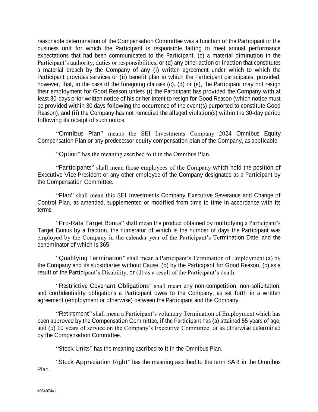 #864974v1 reasonable determination of the Compensation Committee was a function of the Participant or the business unit for which the Participant is responsible failing to meet annual performance expectations that had been communicated to the Participant, (c) a material diminution in the Participant’s authority, duties or responsibilities, or (d) any other action or inaction that constitutes a material breach by the Company of any (i) written agreement under which to which the Participant provides services or (ii) benefit plan in which the Participant participates; provided, however, that, in the case of the foregoing clauses (c), (d) or (e), the Participant may not resign their employment for Good Reason unless (i) the Participant has provided the Company with at least 30-days prior written notice of his or her intent to resign for Good Reason (which notice must be provided within 30 days following the occurrence of the event(s) purported to constitute Good Reason); and (ii) the Company has not remedied the alleged violation(s) within the 30-day period following its receipt of such notice. “Omnibus Plan” means the SEI Investments Company 2024 Omnibus Equity Compensation Plan or any predecessor equity compensation plan of the Company, as applicable. “Option” has the meaning ascribed to it in the Omnibus Plan. “Participants” shall mean those employees of the Company which hold the position of Executive Vice President or any other employee of the Company designated as a Participant by the Compensation Committee. “Plan” shall mean this SEI Investments Company Executive Severance and Change of Control Plan, as amended, supplemented or modified from time to time in accordance with its terms. “Pro-Rata Target Bonus” shall mean the product obtained by multiplying a Participant’s Target Bonus by a fraction, the numerator of which is the number of days the Participant was employed by the Company in the calendar year of the Participant’s Termination Date, and the denominator of which is 365. “Qualifying Termination” shall mean a Participant’s Termination of Employment (a) by the Company and its subsidiaries without Cause, (b) by the Participant for Good Reason, (c) as a result of the Participant’s Disability, or (d) as a result of the Participant’s death. “Restrictive Covenant Obligations” shall mean any non-competition, non-solicitation, and confidentiality obligations a Participant owes to the Company, as set forth in a written agreement (employment or otherwise) between the Participant and the Company. “Retirement” shall mean a Participant’s voluntary Termination of Employment which has been approved by the Compensation Committee, if the Participant has (a) attained 55 years of age, and (b) 10 years of service on the Company’s Executive Committee, or as otherwise determined by the Compensation Committee. “Stock Units” has the meaning ascribed to it in the Omnibus Plan. “Stock Appreciation Right” has the meaning ascribed to the term SAR in the Omnibus Plan.