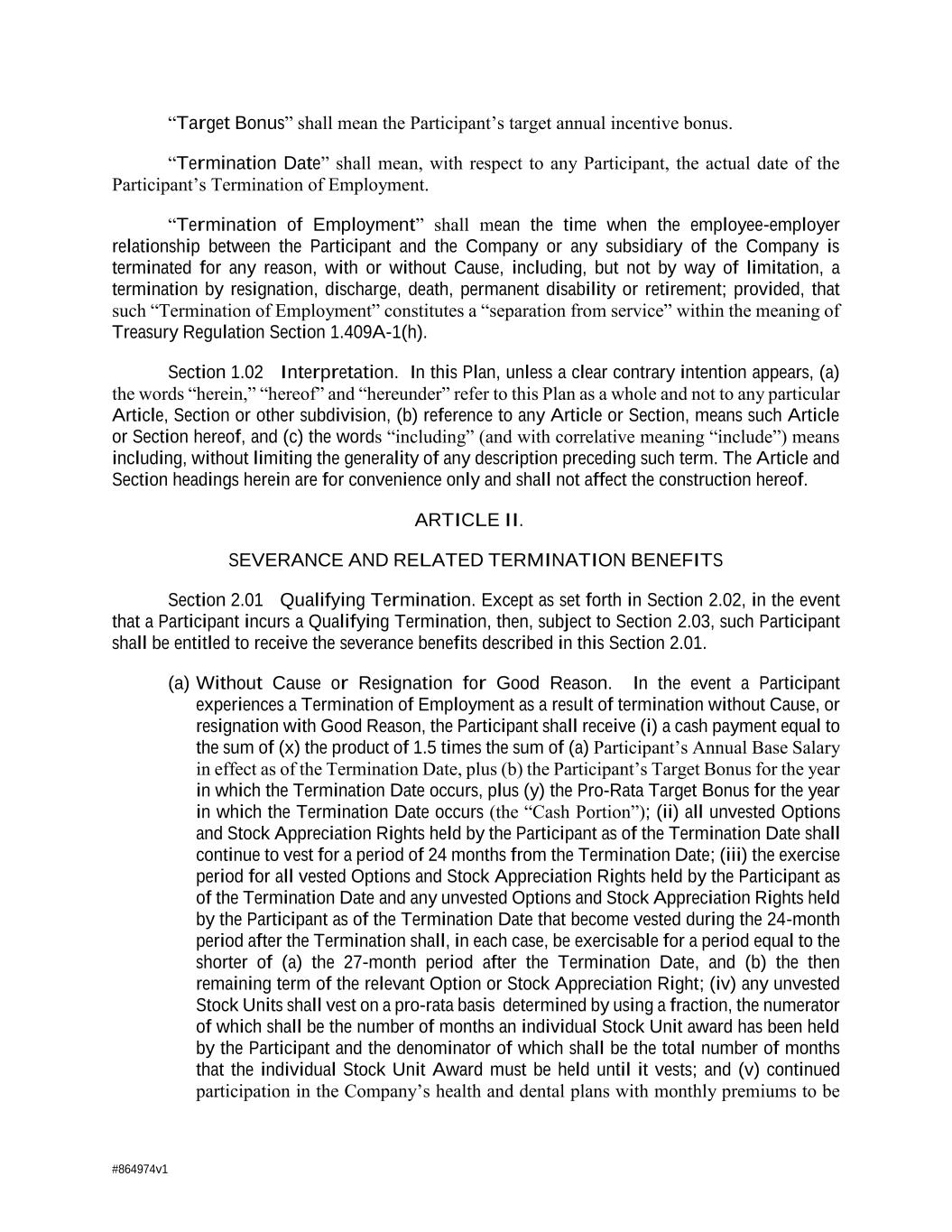 #864974v1 “Target Bonus” shall mean the Participant’s target annual incentive bonus. “Termination Date” shall mean, with respect to any Participant, the actual date of the Participant’s Termination of Employment. “Termination of Employment” shall mean the time when the employee-employer relationship between the Participant and the Company or any subsidiary of the Company is terminated for any reason, with or without Cause, including, but not by way of limitation, a termination by resignation, discharge, death, permanent disability or retirement; provided, that such “Termination of Employment” constitutes a “separation from service” within the meaning of Treasury Regulation Section 1.409A-1(h). Section 1.02 Interpretation. In this Plan, unless a clear contrary intention appears, (a) the words “herein,” “hereof” and “hereunder” refer to this Plan as a whole and not to any particular Article, Section or other subdivision, (b) reference to any Article or Section, means such Article or Section hereof, and (c) the words “including” (and with correlative meaning “include”) means including, without limiting the generality of any description preceding such term. The Article and Section headings herein are for convenience only and shall not affect the construction hereof. ARTICLE II. SEVERANCE AND RELATED TERMINATION BENEFITS Section 2.01 Qualifying Termination. Except as set forth in Section 2.02, in the event that a Participant incurs a Qualifying Termination, then, subject to Section 2.03, such Participant shall be entitled to receive the severance benefits described in this Section 2.01. (a) Without Cause or Resignation for Good Reason. In the event a Participant experiences a Termination of Employment as a result of termination without Cause, or resignation with Good Reason, the Participant shall receive (i) a cash payment equal to the sum of (x) the product of 1.5 times the sum of (a) Participant’s Annual Base Salary in effect as of the Termination Date, plus (b) the Participant’s Target Bonus for the year in which the Termination Date occurs, plus (y) the Pro-Rata Target Bonus for the year in which the Termination Date occurs (the “Cash Portion”); (ii) all unvested Options and Stock Appreciation Rights held by the Participant as of the Termination Date shall continue to vest for a period of 24 months from the Termination Date; (iii) the exercise period for all vested Options and Stock Appreciation Rights held by the Participant as of the Termination Date and any unvested Options and Stock Appreciation Rights held by the Participant as of the Termination Date that become vested during the 24-month period after the Termination shall, in each case, be exercisable for a period equal to the shorter of (a) the 27-month period after the Termination Date, and (b) the then remaining term of the relevant Option or Stock Appreciation Right; (iv) any unvested Stock Units shall vest on a pro-rata basis determined by using a fraction, the numerator of which shall be the number of months an individual Stock Unit award has been held by the Participant and the denominator of which shall be the total number of months that the individual Stock Unit Award must be held until it vests; and (v) continued participation in the Company’s health and dental plans with monthly premiums to be