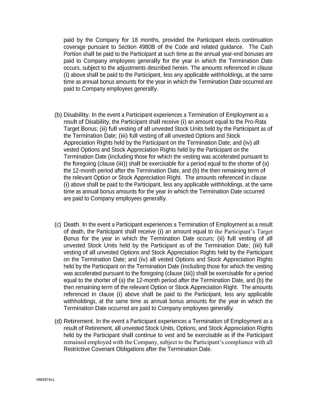 #864974v1 paid by the Company for 18 months, provided the Participant elects continuation coverage pursuant to Section 4980B of the Code and related guidance. The Cash Portion shall be paid to the Participant at such time as the annual year-end bonuses are paid to Company employees generally for the year in which the Termination Date occurs, subject to the adjustments described herein. The amounts referenced in clause (i) above shall be paid to the Participant, less any applicable withholdings, at the same time as annual bonus amounts for the year in which the Termination Date occurred are paid to Company employees generally. (b) Disability. In the event a Participant experiences a Termination of Employment as a result of Disability, the Participant shall receive (i) an amount equal to the Pro-Rata Target Bonus; (ii) full vesting of all unvested Stock Units held by the Participant as of the Termination Date; (iii) full vesting of all unvested Options and Stock Appreciation Rights held by the Participant on the Termination Date; and (iv) all vested Options and Stock Appreciation Rights held by the Participant on the Termination Date (including those for which the vesting was accelerated pursuant to the foregoing (clause (iii)) shall be exercisable for a period equal to the shorter of (a) the 12-month period after the Termination Date, and (b) the then remaining term of the relevant Option or Stock Appreciation Right. The amounts referenced in clause (i) above shall be paid to the Participant, less any applicable withholdings, at the same time as annual bonus amounts for the year in which the Termination Date occurred are paid to Company employees generally. (c) Death. In the event a Participant experiences a Termination of Employment as a result of death, the Participant shall receive (i) an amount equal to the Participant’s Target Bonus for the year in which the Termination Date occurs; (ii) full vesting of all unvested Stock Units held by the Participant as of the Termination Date; (iii) full vesting of all unvested Options and Stock Appreciation Rights held by the Participant on the Termination Date; and (iv) all vested Options and Stock Appreciation Rights held by the Participant on the Termination Date (including those for which the vesting was accelerated pursuant to the foregoing (clause (iii)) shall be exercisable for a period equal to the shorter of (a) the 12-month period after the Termination Date, and (b) the then remaining term of the relevant Option or Stock Appreciation Right. The amounts referenced in clause (i) above shall be paid to the Participant, less any applicable withholdings, at the same time as annual bonus amounts for the year in which the Termination Date occurred are paid to Company employees generally. (d) Retirement. In the event a Participant experiences a Termination of Employment as a result of Retirement, all unvested Stock Units, Options, and Stock Appreciation Rights held by the Participant shall continue to vest and be exercisable as if the Participant remained employed with the Company, subject to the Participant’s compliance with all Restrictive Covenant Obligations after the Termination Date.