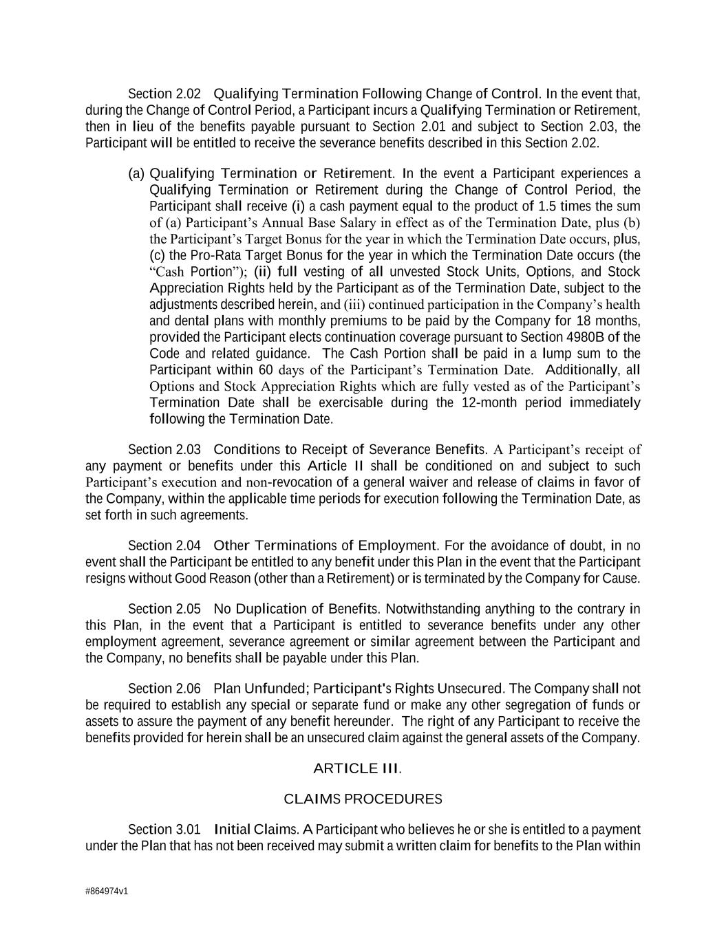 #864974v1 Section 2.02 Qualifying Termination Following Change of Control. In the event that, during the Change of Control Period, a Participant incurs a Qualifying Termination or Retirement, then in lieu of the benefits payable pursuant to Section 2.01 and subject to Section 2.03, the Participant will be entitled to receive the severance benefits described in this Section 2.02. (a) Qualifying Termination or Retirement. In the event a Participant experiences a Qualifying Termination or Retirement during the Change of Control Period, the Participant shall receive (i) a cash payment equal to the product of 1.5 times the sum of (a) Participant’s Annual Base Salary in effect as of the Termination Date, plus (b) the Participant’s Target Bonus for the year in which the Termination Date occurs, plus, (c) the Pro-Rata Target Bonus for the year in which the Termination Date occurs (the “Cash Portion”); (ii) full vesting of all unvested Stock Units, Options, and Stock Appreciation Rights held by the Participant as of the Termination Date, subject to the adjustments described herein, and (iii) continued participation in the Company’s health and dental plans with monthly premiums to be paid by the Company for 18 months, provided the Participant elects continuation coverage pursuant to Section 4980B of the Code and related guidance. The Cash Portion shall be paid in a lump sum to the Participant within 60 days of the Participant’s Termination Date. Additionally, all Options and Stock Appreciation Rights which are fully vested as of the Participant’s Termination Date shall be exercisable during the 12-month period immediately following the Termination Date. Section 2.03 Conditions to Receipt of Severance Benefits. A Participant’s receipt of any payment or benefits under this Article II shall be conditioned on and subject to such Participant’s execution and non-revocation of a general waiver and release of claims in favor of the Company, within the applicable time periods for execution following the Termination Date, as set forth in such agreements. Section 2.04 Other Terminations of Employment. For the avoidance of doubt, in no event shall the Participant be entitled to any benefit under this Plan in the event that the Participant resigns without Good Reason (other than a Retirement) or is terminated by the Company for Cause. Section 2.05 No Duplication of Benefits. Notwithstanding anything to the contrary in this Plan, in the event that a Participant is entitled to severance benefits under any other employment agreement, severance agreement or similar agreement between the Participant and the Company, no benefits shall be payable under this Plan. Section 2.06 Plan Unfunded; Participant's Rights Unsecured. The Company shall not be required to establish any special or separate fund or make any other segregation of funds or assets to assure the payment of any benefit hereunder. The right of any Participant to receive the benefits provided for herein shall be an unsecured claim against the general assets of the Company. ARTICLE III. CLAIMS PROCEDURES Section 3.01 Initial Claims. A Participant who believes he or she is entitled to a payment under the Plan that has not been received may submit a written claim for benefits to the Plan within