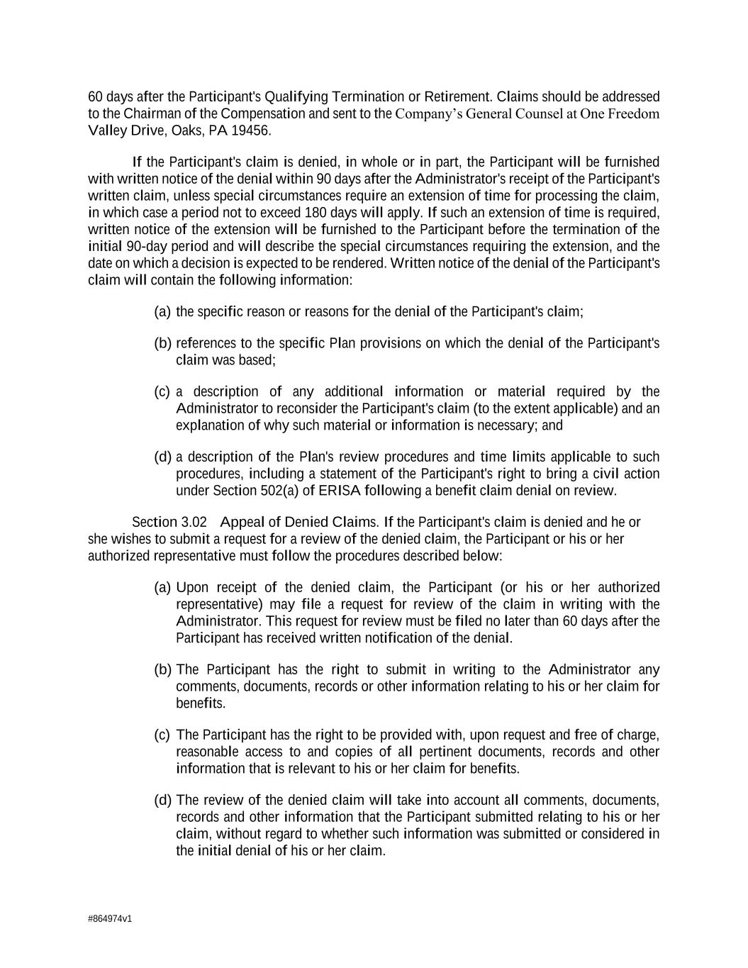 #864974v1 60 days after the Participant's Qualifying Termination or Retirement. Claims should be addressed to the Chairman of the Compensation and sent to the Company’s General Counsel at One Freedom Valley Drive, Oaks, PA 19456. If the Participant's claim is denied, in whole or in part, the Participant will be furnished with written notice of the denial within 90 days after the Administrator's receipt of the Participant's written claim, unless special circumstances require an extension of time for processing the claim, in which case a period not to exceed 180 days will apply. If such an extension of time is required, written notice of the extension will be furnished to the Participant before the termination of the initial 90-day period and will describe the special circumstances requiring the extension, and the date on which a decision is expected to be rendered. Written notice of the denial of the Participant's claim will contain the following information: (a) the specific reason or reasons for the denial of the Participant's claim; (b) references to the specific Plan provisions on which the denial of the Participant's claim was based; (c) a description of any additional information or material required by the Administrator to reconsider the Participant's claim (to the extent applicable) and an explanation of why such material or information is necessary; and (d) a description of the Plan's review procedures and time limits applicable to such procedures, including a statement of the Participant's right to bring a civil action under Section 502(a) of ERISA following a benefit claim denial on review. Section 3.02 Appeal of Denied Claims. If the Participant's claim is denied and he or she wishes to submit a request for a review of the denied claim, the Participant or his or her authorized representative must follow the procedures described below: (a) Upon receipt of the denied claim, the Participant (or his or her authorized representative) may file a request for review of the claim in writing with the Administrator. This request for review must be filed no later than 60 days after the Participant has received written notification of the denial. (b) The Participant has the right to submit in writing to the Administrator any comments, documents, records or other information relating to his or her claim for benefits. (c) The Participant has the right to be provided with, upon request and free of charge, reasonable access to and copies of all pertinent documents, records and other information that is relevant to his or her claim for benefits. (d) The review of the denied claim will take into account all comments, documents, records and other information that the Participant submitted relating to his or her claim, without regard to whether such information was submitted or considered in the initial denial of his or her claim.