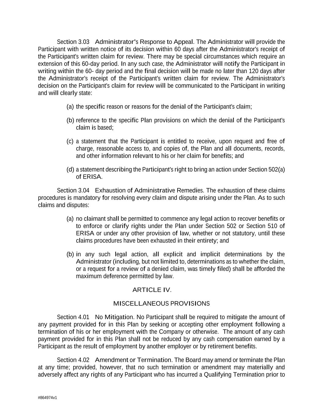 #864974v1 Section 3.03 Administrator's Response to Appeal. The Administrator will provide the Participant with written notice of its decision within 60 days after the Administrator's receipt of the Participant's written claim for review. There may be special circumstances which require an extension of this 60-day period. In any such case, the Administrator will notify the Participant in writing within the 60- day period and the final decision will be made no later than 120 days after the Administrator's receipt of the Participant's written claim for review. The Administrator's decision on the Participant's claim for review will be communicated to the Participant in writing and will clearly state: (a) the specific reason or reasons for the denial of the Participant's claim; (b) reference to the specific Plan provisions on which the denial of the Participant's claim is based; (c) a statement that the Participant is entitled to receive, upon request and free of charge, reasonable access to, and copies of, the Plan and all documents, records, and other information relevant to his or her claim for benefits; and (d) a statement describing the Participant's right to bring an action under Section 502(a) of ERISA. Section 3.04 Exhaustion of Administrative Remedies. The exhaustion of these claims procedures is mandatory for resolving every claim and dispute arising under the Plan. As to such claims and disputes: (a) no claimant shall be permitted to commence any legal action to recover benefits or to enforce or clarify rights under the Plan under Section 502 or Section 510 of ERISA or under any other provision of law, whether or not statutory, until these claims procedures have been exhausted in their entirety; and (b) in any such legal action, all explicit and implicit determinations by the Administrator (including, but not limited to, determinations as to whether the claim, or a request for a review of a denied claim, was timely filed) shall be afforded the maximum deference permitted by law. ARTICLE IV. MISCELLANEOUS PROVISIONS Section 4.01 No Mitigation. No Participant shall be required to mitigate the amount of any payment provided for in this Plan by seeking or accepting other employment following a termination of his or her employment with the Company or otherwise. The amount of any cash payment provided for in this Plan shall not be reduced by any cash compensation earned by a Participant as the result of employment by another employer or by retirement benefits. Section 4.02 Amendment or Termination. The Board may amend or terminate the Plan at any time; provided, however, that no such termination or amendment may materially and adversely affect any rights of any Participant who has incurred a Qualifying Termination prior to
