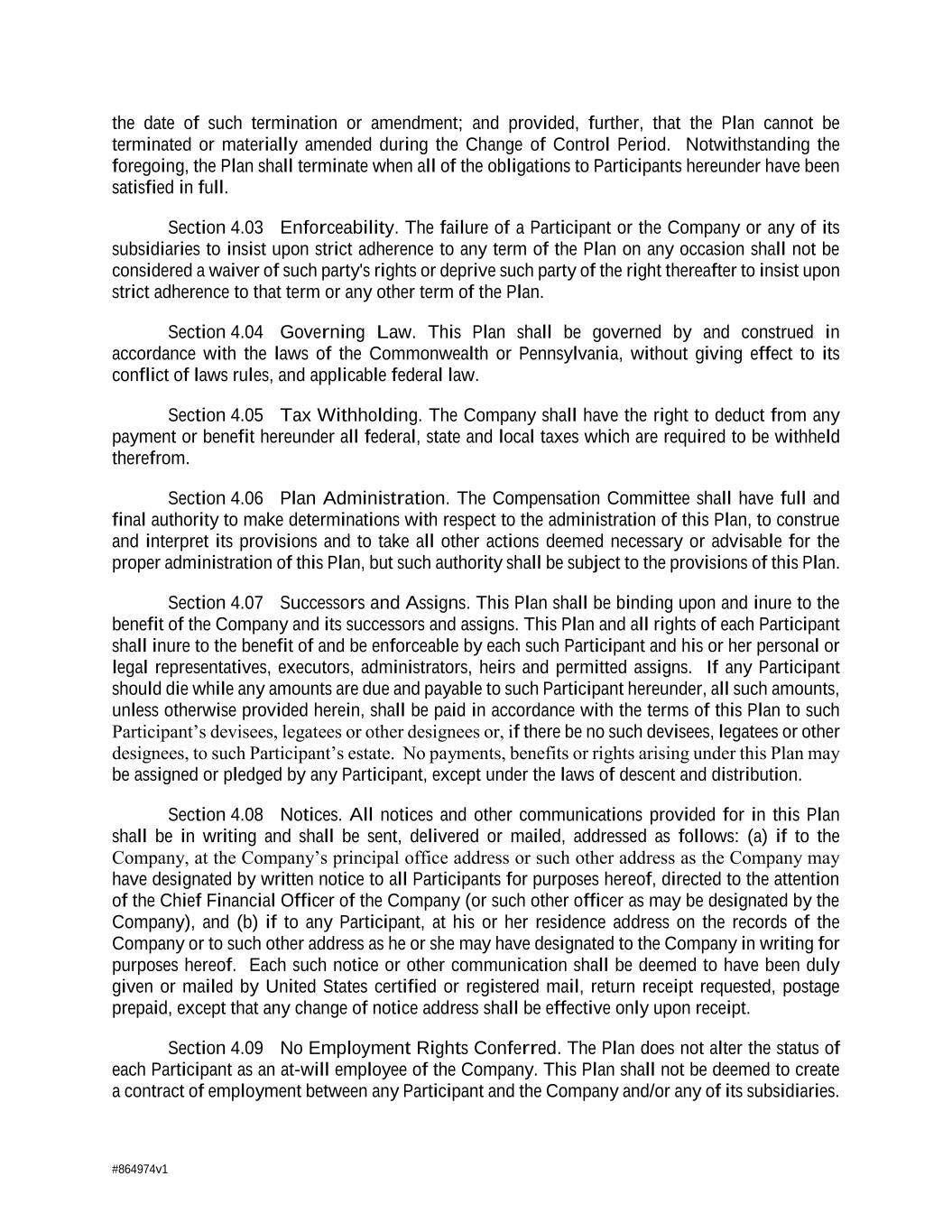 #864974v1 the date of such termination or amendment; and provided, further, that the Plan cannot be terminated or materially amended during the Change of Control Period. Notwithstanding the foregoing, the Plan shall terminate when all of the obligations to Participants hereunder have been satisfied in full. Section 4.03 Enforceability. The failure of a Participant or the Company or any of its subsidiaries to insist upon strict adherence to any term of the Plan on any occasion shall not be considered a waiver of such party's rights or deprive such party of the right thereafter to insist upon strict adherence to that term or any other term of the Plan. Section 4.04 Governing Law. This Plan shall be governed by and construed in accordance with the laws of the Commonwealth or Pennsylvania, without giving effect to its conflict of laws rules, and applicable federal law. Section 4.05 Tax Withholding. The Company shall have the right to deduct from any payment or benefit hereunder all federal, state and local taxes which are required to be withheld therefrom. Section 4.06 Plan Administration. The Compensation Committee shall have full and final authority to make determinations with respect to the administration of this Plan, to construe and interpret its provisions and to take all other actions deemed necessary or advisable for the proper administration of this Plan, but such authority shall be subject to the provisions of this Plan. Section 4.07 Successors and Assigns. This Plan shall be binding upon and inure to the benefit of the Company and its successors and assigns. This Plan and all rights of each Participant shall inure to the benefit of and be enforceable by each such Participant and his or her personal or legal representatives, executors, administrators, heirs and permitted assigns. If any Participant should die while any amounts are due and payable to such Participant hereunder, all such amounts, unless otherwise provided herein, shall be paid in accordance with the terms of this Plan to such Participant’s devisees, legatees or other designees or, if there be no such devisees, legatees or other designees, to such Participant’s estate. No payments, benefits or rights arising under this Plan may be assigned or pledged by any Participant, except under the laws of descent and distribution. Section 4.08 Notices. All notices and other communications provided for in this Plan shall be in writing and shall be sent, delivered or mailed, addressed as follows: (a) if to the Company, at the Company’s principal office address or such other address as the Company may have designated by written notice to all Participants for purposes hereof, directed to the attention of the Chief Financial Officer of the Company (or such other officer as may be designated by the Company), and (b) if to any Participant, at his or her residence address on the records of the Company or to such other address as he or she may have designated to the Company in writing for purposes hereof. Each such notice or other communication shall be deemed to have been duly given or mailed by United States certified or registered mail, return receipt requested, postage prepaid, except that any change of notice address shall be effective only upon receipt. Section 4.09 No Employment Rights Conferred. The Plan does not alter the status of each Participant as an at-will employee of the Company. This Plan shall not be deemed to create a contract of employment between any Participant and the Company and/or any of its subsidiaries.