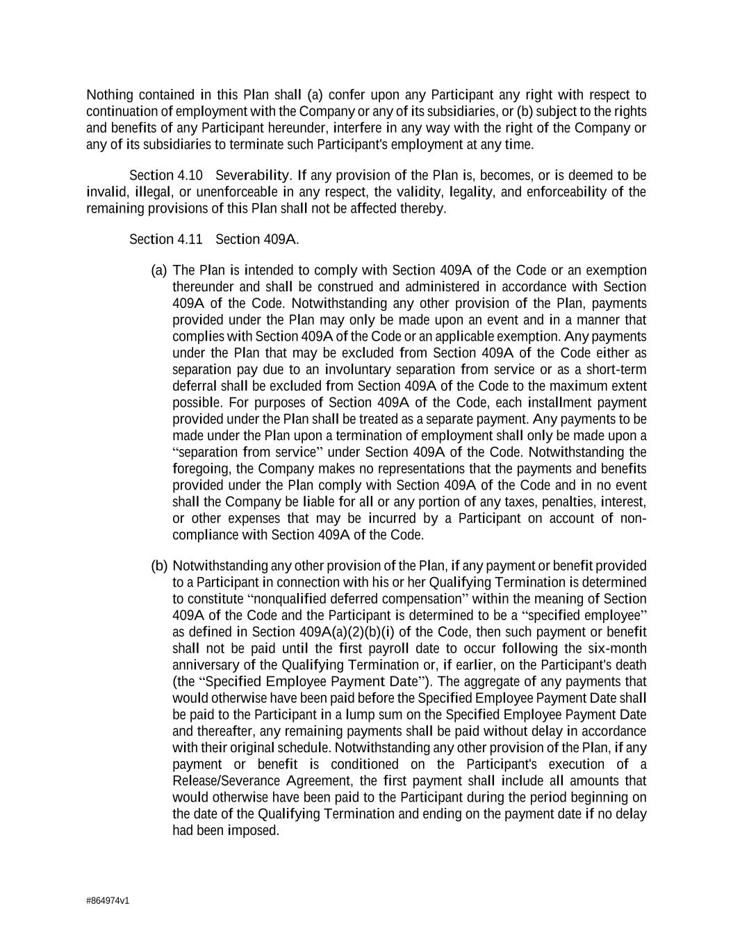 #864974v1 Nothing contained in this Plan shall (a) confer upon any Participant any right with respect to continuation of employment with the Company or any of its subsidiaries, or (b) subject to the rights and benefits of any Participant hereunder, interfere in any way with the right of the Company or any of its subsidiaries to terminate such Participant's employment at any time. Section 4.10 Severability. If any provision of the Plan is, becomes, or is deemed to be invalid, illegal, or unenforceable in any respect, the validity, legality, and enforceability of the remaining provisions of this Plan shall not be affected thereby. Section 4.11 Section 409A. (a) The Plan is intended to comply with Section 409A of the Code or an exemption thereunder and shall be construed and administered in accordance with Section 409A of the Code. Notwithstanding any other provision of the Plan, payments provided under the Plan may only be made upon an event and in a manner that complies with Section 409A of the Code or an applicable exemption. Any payments under the Plan that may be excluded from Section 409A of the Code either as separation pay due to an involuntary separation from service or as a short-term deferral shall be excluded from Section 409A of the Code to the maximum extent possible. For purposes of Section 409A of the Code, each installment payment provided under the Plan shall be treated as a separate payment. Any payments to be made under the Plan upon a termination of employment shall only be made upon a “separation from service” under Section 409A of the Code. Notwithstanding the foregoing, the Company makes no representations that the payments and benefits provided under the Plan comply with Section 409A of the Code and in no event shall the Company be liable for all or any portion of any taxes, penalties, interest, or other expenses that may be incurred by a Participant on account of non- compliance with Section 409A of the Code. (b) Notwithstanding any other provision of the Plan, if any payment or benefit provided to a Participant in connection with his or her Qualifying Termination is determined to constitute “nonqualified deferred compensation” within the meaning of Section 409A of the Code and the Participant is determined to be a “specified employee” as defined in Section 409A(a)(2)(b)(i) of the Code, then such payment or benefit shall not be paid until the first payroll date to occur following the six-month anniversary of the Qualifying Termination or, if earlier, on the Participant's death (the “Specified Employee Payment Date”). The aggregate of any payments that would otherwise have been paid before the Specified Employee Payment Date shall be paid to the Participant in a lump sum on the Specified Employee Payment Date and thereafter, any remaining payments shall be paid without delay in accordance with their original schedule. Notwithstanding any other provision of the Plan, if any payment or benefit is conditioned on the Participant's execution of a Release/Severance Agreement, the first payment shall include all amounts that would otherwise have been paid to the Participant during the period beginning on the date of the Qualifying Termination and ending on the payment date if no delay had been imposed.