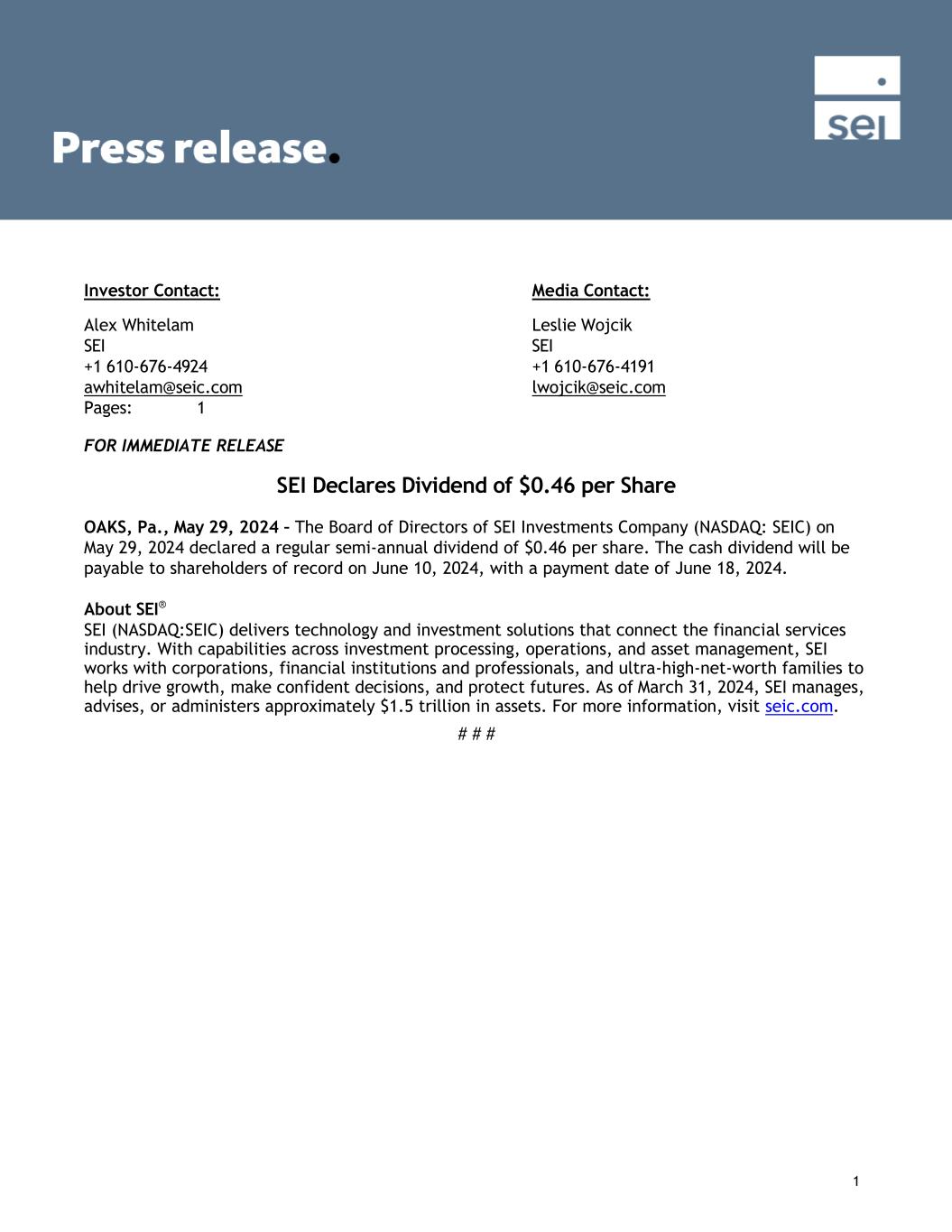 1 Investor Contact: Media Contact: Alex Whitelam Leslie Wojcik SEI SEI +1 610-676-4924 +1 610-676-4191 awhitelam@seic.com lwojcik@seic.com Pages: 1 FOR IMMEDIATE RELEASE SEI Declares Dividend of $0.46 per Share OAKS, Pa., May 29, 2024 – The Board of Directors of SEI Investments Company (NASDAQ: SEIC) on May 29, 2024 declared a regular semi-annual dividend of $0.46 per share. The cash dividend will be payable to shareholders of record on June 10, 2024, with a payment date of June 18, 2024. About SEI® SEI (NASDAQ:SEIC) delivers technology and investment solutions that connect the financial services industry. With capabilities across investment processing, operations, and asset management, SEI works with corporations, financial institutions and professionals, and ultra-high-net-worth families to help drive growth, make confident decisions, and protect futures. As of March 31, 2024, SEI manages, advises, or administers approximately $1.5 trillion in assets. For more information, visit seic.com. # # #