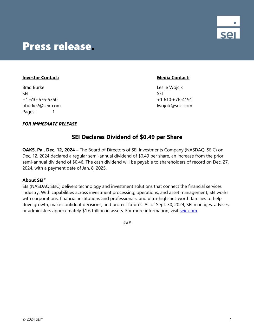 © 2024 SEI® 1 Investor Contact: Media Contact: Brad Burke Leslie Wojcik SEI SEI +1 610-676-5350 +1 610-676-4191 bburke2@seic.com lwojcik@seic.com Pages: 1 FOR IMMEDIATE RELEASE SEI Declares Dividend of $0.49 per Share OAKS, Pa., Dec. 12, 2024 – The Board of Directors of SEI Investments Company (NASDAQ: SEIC) on Dec. 12, 2024 declared a regular semi-annual dividend of $0.49 per share, an increase from the prior semi-annual dividend of $0.46. The cash dividend will be payable to shareholders of record on Dec. 27, 2024, with a payment date of Jan. 8, 2025. About SEI® SEI (NASDAQ:SEIC) delivers technology and investment solutions that connect the financial services industry. With capabilities across investment processing, operations, and asset management, SEI works with corporations, financial institutions and professionals, and ultra-high-net-worth families to help drive growth, make confident decisions, and protect futures. As of Sept. 30, 2024, SEI manages, advises, or administers approximately $1.6 trillion in assets. For more information, visit seic.com. ### Press release.