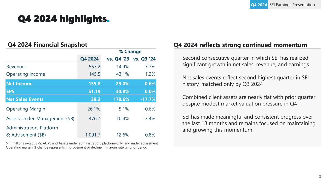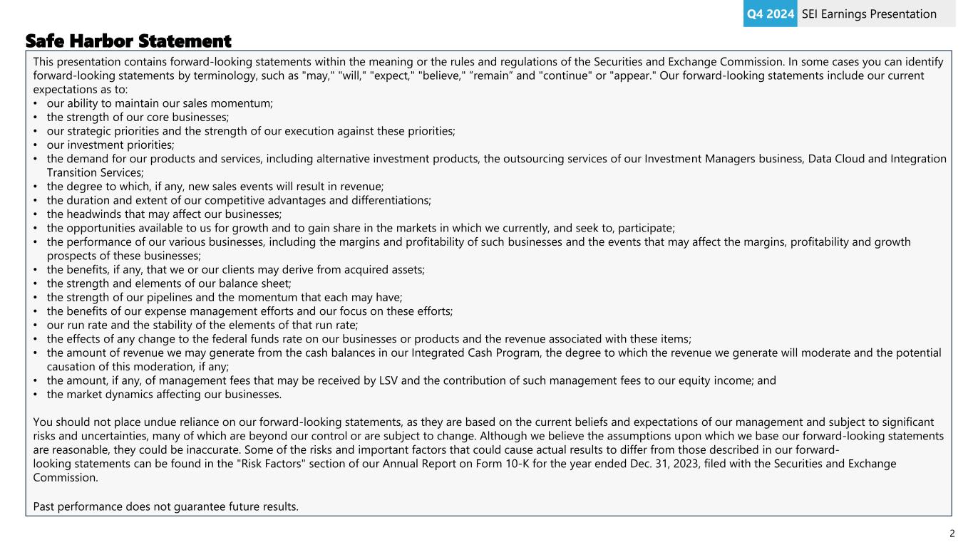 This presentation contains forward-looking statements within the meaning or the rules and regulations of the Securities and Exchange Commission. In some cases you can identify forward-looking statements by terminology, such as "may," "will," "expect," "believe," ”remain” and "continue" or "appear." Our forward-looking statements include our current expectations as to: • our ability to maintain our sales momentum; • the strength of our core businesses; • our strategic priorities and the strength of our execution against these priorities; • our investment priorities; • the demand for our products and services, including alternative investment products, the outsourcing services of our Investment Managers business, Data Cloud and Integration Transition Services; • the degree to which, if any, new sales events will result in revenue; • the duration and extent of our competitive advantages and differentiations; • the headwinds that may affect our businesses; • the opportunities available to us for growth and to gain share in the markets in which we currently, and seek to, participate; • the performance of our various businesses, including the margins and profitability of such businesses and the events that may affect the margins, profitability and growth prospects of these businesses; • the benefits, if any, that we or our clients may derive from acquired assets; • the strength and elements of our balance sheet; • the strength of our pipelines and the momentum that each may have; • the benefits of our expense management efforts and our focus on these efforts; • our run rate and the stability of the elements of that run rate; • the effects of any change to the federal funds rate on our businesses or products and the revenue associated with these items; • the amount of revenue we may generate from the cash balances in our Integrated Cash Program, the degree to which the revenue we generate will moderate and the potential causation of this moderation, if any; • the amount, if any, of management fees that may be received by LSV and the contribution of such management fees to our equity income; and • the market dynamics affecting our businesses. You should not place undue reliance on our forward-looking statements, as they are based on the current beliefs and expectations of our management and subject to significant risks and uncertainties, many of which are beyond our control or are subject to change. Although we believe the assumptions upon which we base our forward-looking statements are reasonable, they could be inaccurate. Some of the risks and important factors that could cause actual results to differ from those described in our forward- looking statements can be found in the "Risk Factors" section of our Annual Report on Form 10-K for the year ended Dec. 31, 2023, filed with the Securities and Exchange Commission. Past performance does not guarantee future results. Safe Harbor Statement 2 SEI Earnings PresentationQ4 2024
