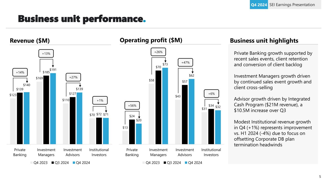 Earnings per share. SEI Earnings PresentationQ4 2024 All business units realized revenue, operating profit, and margin growth vs. Q4 2023 Q4 EPS matches prior quarter’s record level despite $0.02 headwind from items affecting comparability: • $0.04 from higher incentive comp. payout % for full-year ‘24 • $0.05 from stock-based compensation timing • $0.02 benefit from FX gains within corporate overhead • $0.05 tax rate benefit from stock option exercises/provision true-up Q4 EPS grew 31% vs. prior year $0.91 $0.04 $0.12 $0.01 $0.09 -$0.01 -$0.01 $0.02 $0.01 $1.19 Q4 2023 Private Banks Investment Advisors Institutional Investors Investment Managers LSV Income Corporate Overhead Tax Rate & Other Share Count Q4 2024 +31% $1.19 -$0.02 $0.03 -$0.01 $0.02 -$0.02 $0.00 $0.01 -$0.01 $1.19 Q3 2024 Private Banks Investment Advisors Institutional Investors Investment Managers LSV Income Corporate Overhead Tax Rate & Other Share Count Q4 2024 Flat Y e a r- O v e r- Y e a r Q u a rt e r- O v e r- Q u a rt e r $0.06 negative impact from higher incentive comp. and stock-based comp. timing 4