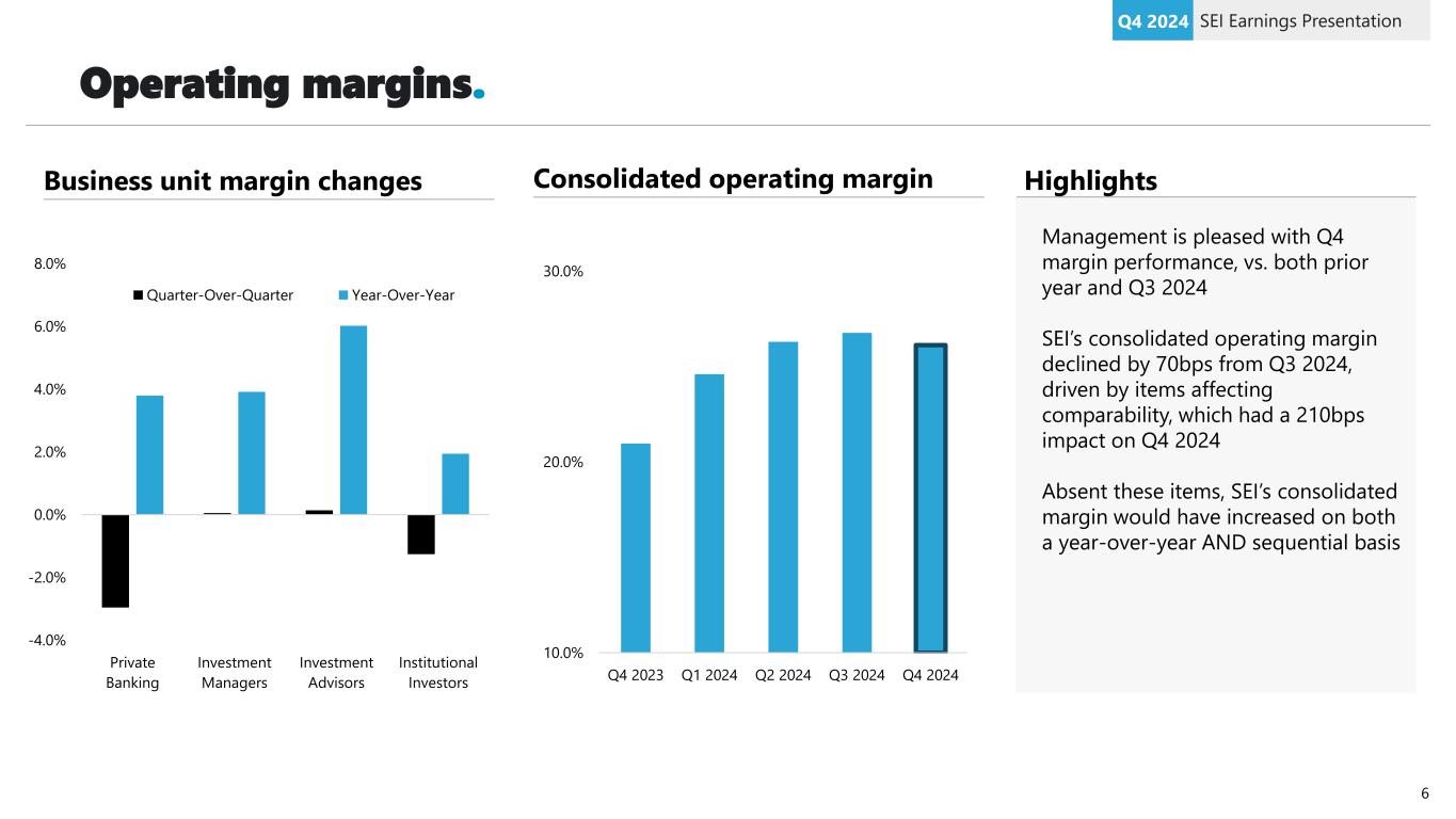 Operating margins. SEI Earnings PresentationQ4 2024 -4.0% -2.0% 0.0% 2.0% 4.0% 6.0% 8.0% Private Banking Investment Managers Investment Advisors Institutional Investors Quarter-Over-Quarter Year-Over-Year Business unit margin changes HighlightsConsolidated operating margin 10.0% 20.0% 30.0% Q4 2023 Q1 2024 Q2 2024 Q3 2024 Q4 2024 Management is pleased with Q4 margin performance, vs. both prior year and Q3 2024 SEI’s consolidated operating margin declined by 70bps from Q3 2024, driven by items affecting comparability, which had a 210bps impact on Q4 2024 Absent these items, SEI’s consolidated margin would have increased on both a year-over-year AND sequential basis 6