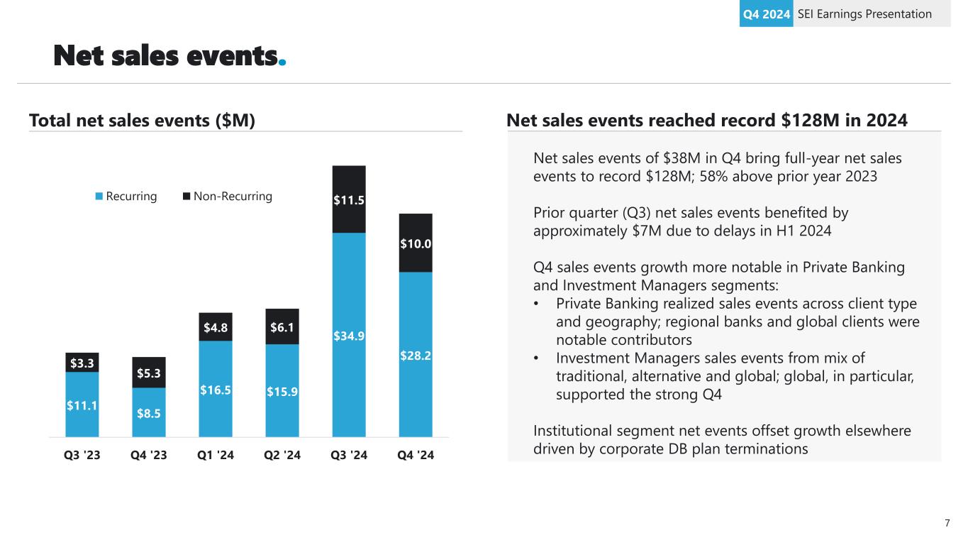 Net sales events. SEI Earnings PresentationQ4 2024 $11.1 $8.5 $16.5 $15.9 $34.9 $28.2 $3.3 $5.3 $4.8 $6.1 $11.5 $10.0 Q3 '23 Q4 '23 Q1 '24 Q2 '24 Q3 '24 Q4 '24 Recurring Non-Recurring Total net sales events ($M) Net sales events of $38M in Q4 bring full-year net sales events to record $128M; 58% above prior year 2023 Prior quarter (Q3) net sales events benefited by approximately $7M due to delays in H1 2024 Q4 sales events growth more notable in Private Banking and Investment Managers segments: • Private Banking realized sales events across client type and geography; regional banks and global clients were notable contributors • Investment Managers sales events from mix of traditional, alternative and global; global, in particular, supported the strong Q4 Institutional segment net events offset growth elsewhere driven by corporate DB plan terminations Net sales events reached record $128M in 2024 7