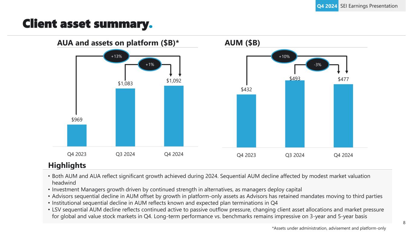 Client asset summary. SEI Earnings PresentationQ4 2024 AUA and assets on platform ($B)* AUM ($B) $969 $1,083 $1,092 Q4 2023 Q3 2024 Q4 2024 +13% +1% $432 $493 $477 Q4 2023 Q3 2024 Q4 2024 +10% -3% Highlights • Both AUM and AUA reflect significant growth achieved during 2024. Sequential AUM decline affected by modest market valuation headwind • Investment Managers growth driven by continued strength in alternatives, as managers deploy capital • Advisors sequential decline in AUM offset by growth in platform-only assets as Advisors has retained mandates moving to third parties • Institutional sequential decline in AUM reflects known and expected plan terminations in Q4 • LSV sequential AUM decline reflects continued active to passive outflow pressure, changing client asset allocations and market pressure for global and value stock markets in Q4. Long-term performance vs. benchmarks remains impressive on 3-year and 5-year basis *Assets under administration, advisement and platform-only 8