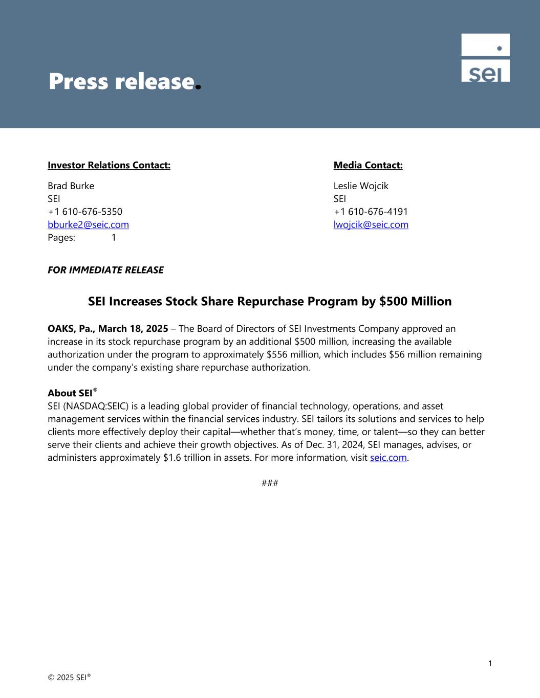 © 2025 SEI® 1 Investor Relations Contact: Media Contact: Brad Burke Leslie Wojcik SEI SEI +1 610-676-5350 +1 610-676-4191 bburke2@seic.com lwojcik@seic.com Pages: 1 FOR IMMEDIATE RELEASE SEI Increases Stock Share Repurchase Program by $500 Million OAKS, Pa., March 18, 2025 – The Board of Directors of SEI Investments Company approved an increase in its stock repurchase program by an additional $500 million, increasing the available authorization under the program to approximately $556 million, which includes $56 million remaining under the company’s existing share repurchase authorization. About SEI® SEI (NASDAQ:SEIC) is a leading global provider of financial technology, operations, and asset management services within the financial services industry. SEI tailors its solutions and services to help clients more effectively deploy their capital—whether that’s money, time, or talent—so they can better serve their clients and achieve their growth objectives. As of Dec. 31, 2024, SEI manages, advises, or administers approximately $1.6 trillion in assets. For more information, visit seic.com. ### Press release.