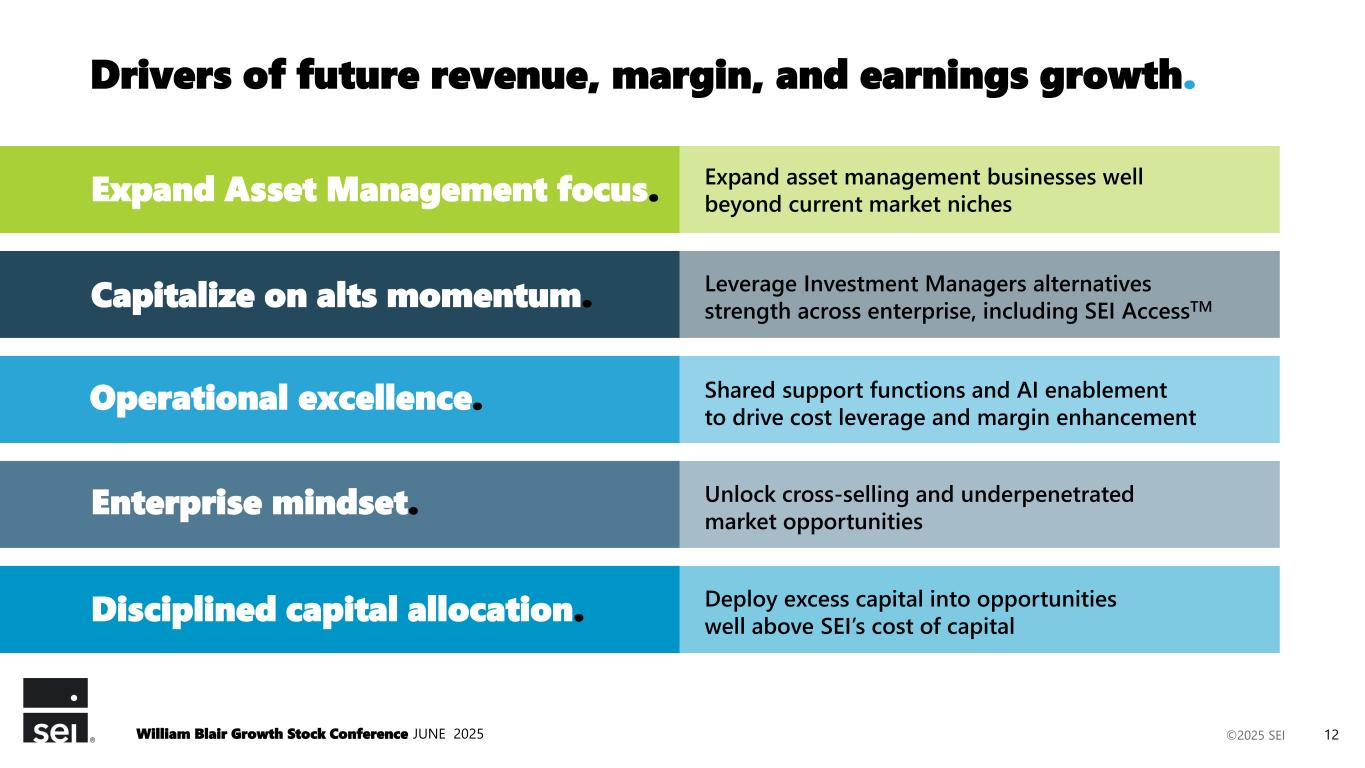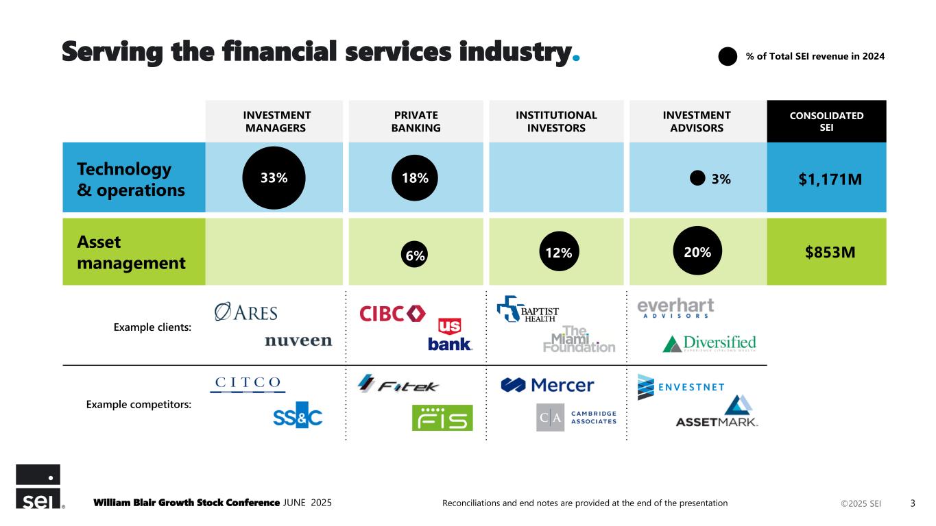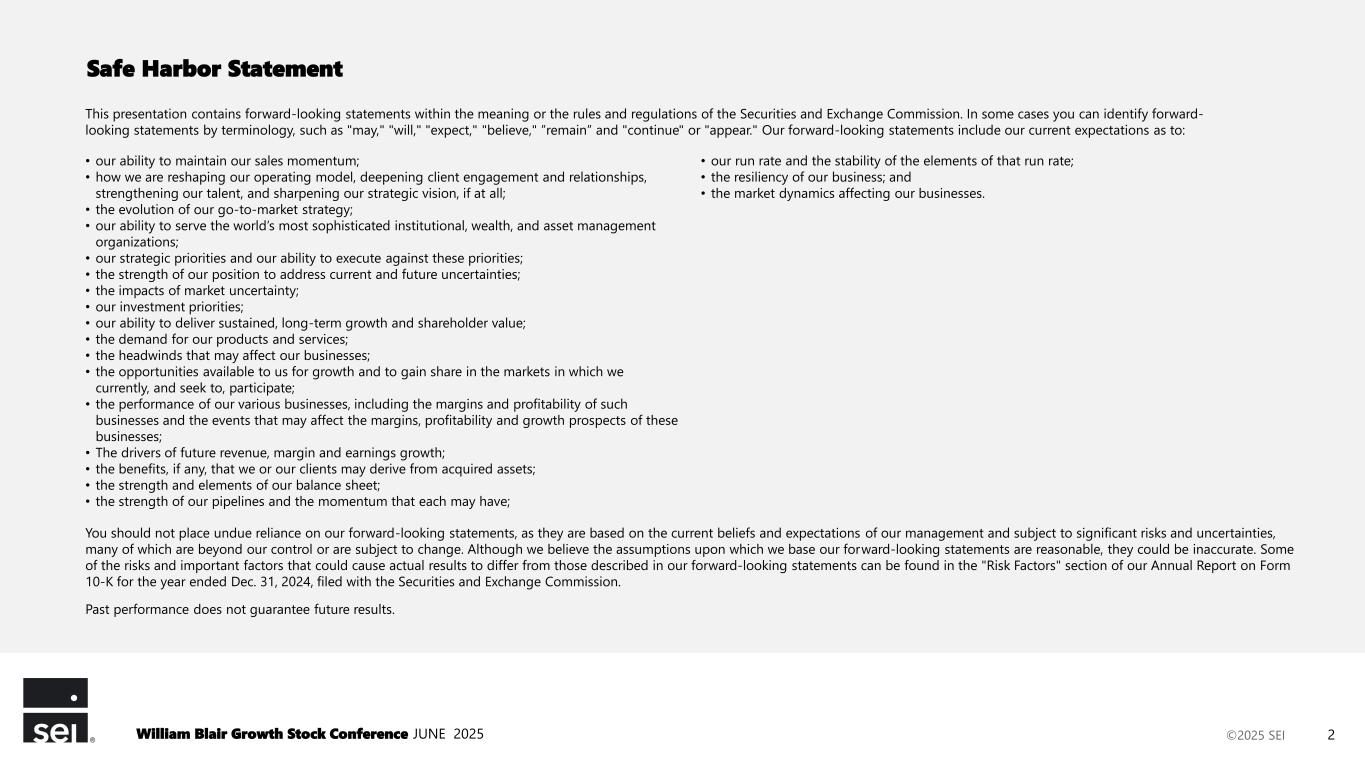 ©2025 SEI Safe Harbor Statement This presentation contains forward-looking statements within the meaning or the rules and regulations of the Securities and Exchange Commission. In some cases you can identify forward- looking statements by terminology, such as "may," "will," "expect," "believe," ”remain” and "continue" or "appear." Our forward-looking statements include our current expectations as to: • our ability to maintain our sales momentum; • how we are reshaping our operating model, deepening client engagement and relationships, strengthening our talent, and sharpening our strategic vision, if at all; • the evolution of our go-to-market strategy; • our ability to serve the world’s most sophisticated institutional, wealth, and asset management organizations; • our strategic priorities and our ability to execute against these priorities; • the strength of our position to address current and future uncertainties; • the impacts of market uncertainty; • our investment priorities; • our ability to deliver sustained, long-term growth and shareholder value; • the demand for our products and services; • the headwinds that may affect our businesses; • the opportunities available to us for growth and to gain share in the markets in which we currently, and seek to, participate; • the performance of our various businesses, including the margins and profitability of such businesses and the events that may affect the margins, profitability and growth prospects of these businesses; • The drivers of future revenue, margin and earnings growth; • the benefits, if any, that we or our clients may derive from acquired assets; • the strength and elements of our balance sheet; • the strength of our pipelines and the momentum that each may have; • our run rate and the stability of the elements of that run rate; • the resiliency of our business; and • the market dynamics affecting our businesses. You should not place undue reliance on our forward-looking statements, as they are based on the current beliefs and expectations of our management and subject to significant risks and uncertainties, many of which are beyond our control or are subject to change. Although we believe the assumptions upon which we base our forward-looking statements are reasonable, they could be inaccurate. Some of the risks and important factors that could cause actual results to differ from those described in our forward-looking statements can be found in the "Risk Factors" section of our Annual Report on Form 10-K for the year ended Dec. 31, 2024, filed with the Securities and Exchange Commission. Past performance does not guarantee future results. William Blair Growth Stock Conference JUNE 2025 2