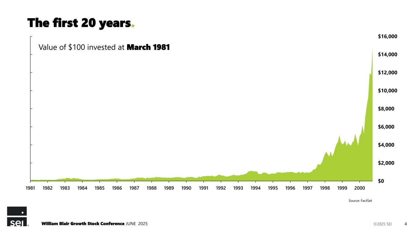 ©2025 SEI $0 $2,000 $4,000 $6,000 $8,000 $10,000 $12,000 $14,000 $16,000 1981 1982 1983 1984 1985 1986 1987 1988 1989 1990 1991 1992 1993 1994 1995 1996 1997 1998 1999 2000 Source: FactSet The first 20 years. Value of $100 invested at March 1981 William Blair Growth Stock Conference JUNE 2025 4