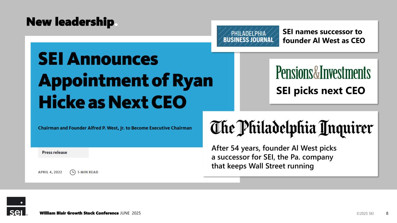 ©2025 SEI SEI names successor to founder Al West as CEO SEI picks next CEO After 54 years, founder Al West picks a successor for SEI, the Pa. company that keeps Wall Street running New leadership. 8William Blair Growth Stock Conference JUNE 2025