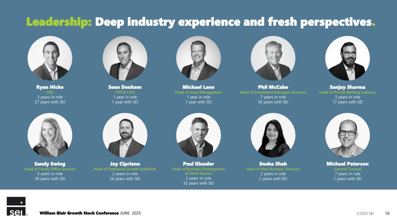 ©2025 SEI $30 $50 $70 $90 Jan 2022 Jul 2022 Jan 2023 Jul 2023 Jan 2024 Jul 2024 Jan 2025 Encouraging progress. SEI share price William Blair Growth Stock Conference JUNE 2025 9 Source: FactSet