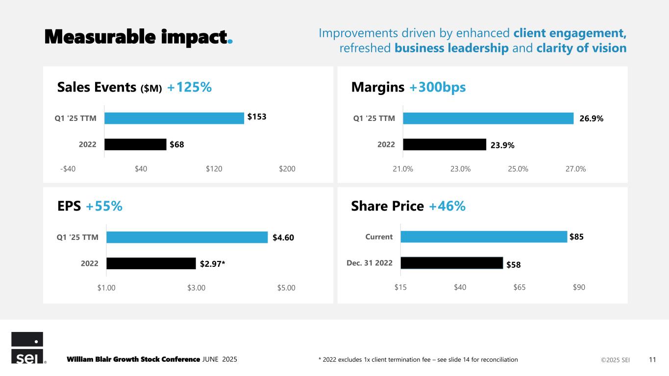 ©2025 SEI Ryan Hicke CEO 3 years in role 27 years with SEI Sandy Ewing Head of Family Office Services 3 years in role 30 years with SEI Sean Denham CFO & COO 1 year in role 1 year with SEI Jay Cipriano Head of Enterprise Growth Initiatives 2 years in role 26 years with SEI Michael Lane Head of Asset Management 1 year in role 1 year with SEI Paul Klauder Head of Business Development & Client Service 2 years in role 32 years with SEI Phil McCabe Head of Investment Managers business 7 years in role 36 years with SEI Sneha Shah Head of New Business Ventures 2 years in role 2 years with SEI Sanjay Sharma Head of Private Banking business 3 years in role 17 years with SEI Michael Peterson General Counsel 7 years in role 7 years with SEI Leadership: Deep industry experience and fresh perspectives. William Blair Growth Stock Conference JUNE 2025 10