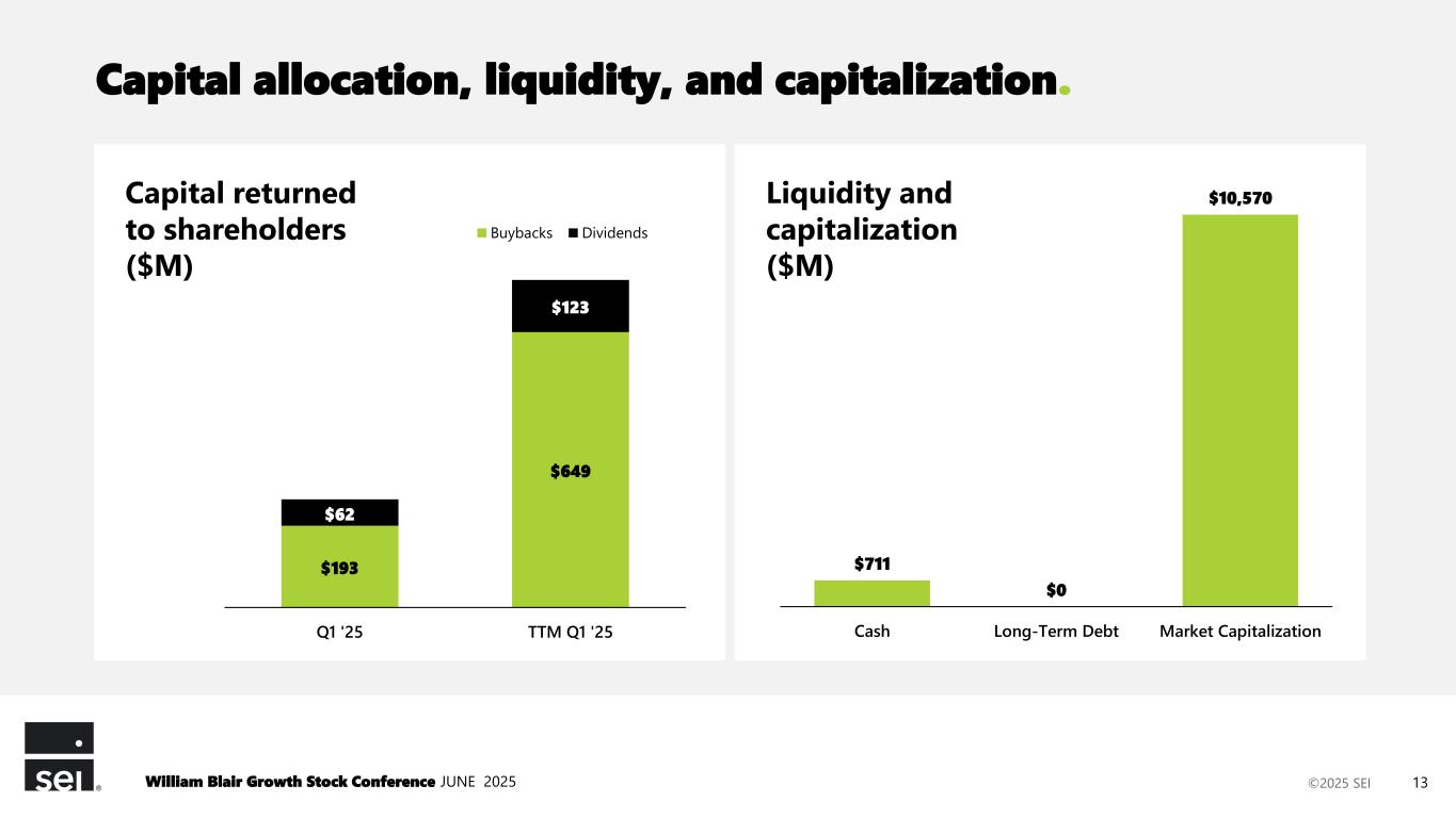 ©2025 SEI Expand Asset Management focus. Expand asset management businesses well beyond current market niches Shared support functions and AI enablement to drive cost leverage and margin enhancement Unlock cross-selling and underpenetrated market opportunities Leverage Investment Managers alternatives strength across enterprise, including SEI AccessTM Deploy excess capital into opportunities well above SEI’s cost of capital Capitalize on alts momentum. Operational excellence. Enterprise mindset. Disciplined capital allocation. William Blair Growth Stock Conference JUNE 2025 12 Drivers of future revenue, margin, and earnings growth.