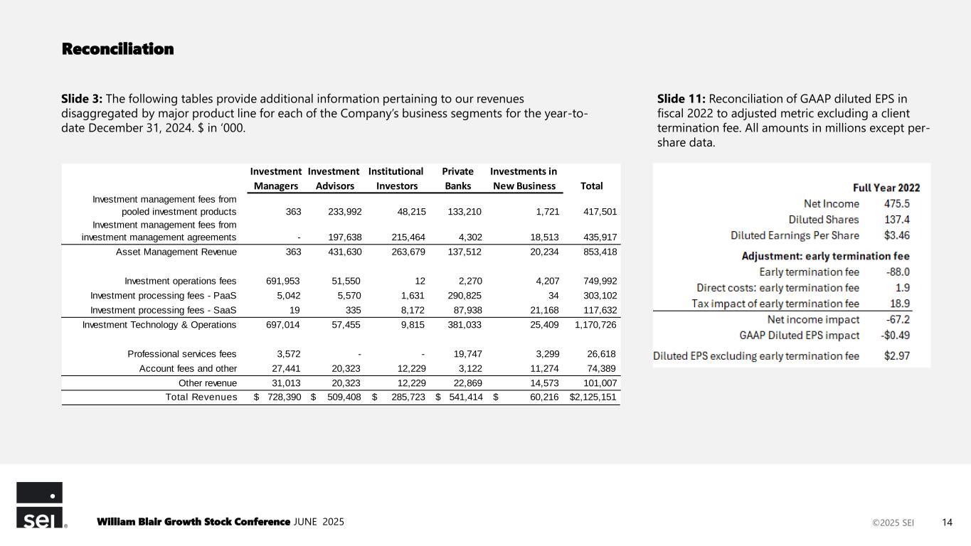 ©2025 SEI Reconciliation William Blair Growth Stock Conference JUNE 2025 14 Slide 3: The following tables provide additional information pertaining to our revenues disaggregated by major product line for each of the Company’s business segments for the year-to- date December 31, 2024. $ in ‘000. Slide 11: Reconciliation of GAAP diluted EPS in fiscal 2022 to adjusted metric excluding a client termination fee. All amounts in millions except per- share data. Investment Investment Institutional Private Investments in Managers Advisors Investors Banks New Business Total Investment management fees from pooled investment products 363 233,992 48,215 133,210 1,721 417,501 Investment management fees from investment management agreements - 197,638 215,464 4,302 18,513 435,917 Asset Management Revenue 363 431,630 263,679 137,512 20,234 853,418 Investment operations fees 691,953 51,550 12 2,270 4,207 749,992 Investment processing fees - PaaS 5,042 5,570 1,631 290,825 34 303,102 Investment processing fees - SaaS 19 335 8,172 87,938 21,168 117,632 Investment Technology & Operations 697,014 57,455 9,815 381,033 25,409 1,170,726 Professional services fees 3,572 - - 19,747 3,299 26,618 Account fees and other 27,441 20,323 12,229 3,122 11,274 74,389 Other revenue 31,013 20,323 12,229 22,869 14,573 101,007 Total Revenues $ 728,390 $ 509,408 $ 285,723 $ 541,414 $ 60,216 $2,125,151