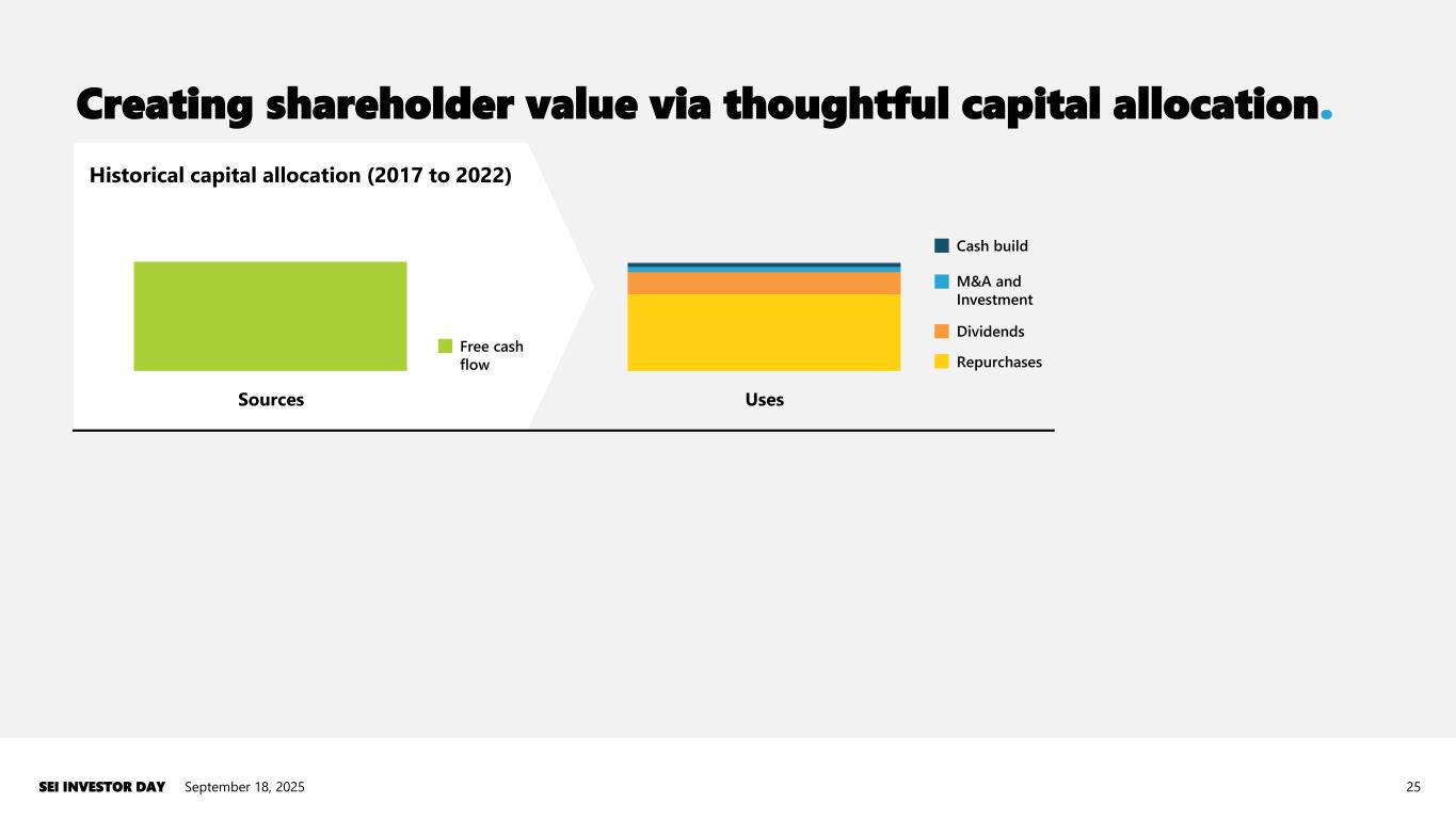 Creating shareholder value via thoughtful capital allocation. September 18, 2025SEI INVESTOR DAY 25 Historical capital allocation (2017 to 2022) Free cash flow Cash build M&A and Investment Dividends Repurchases Sources Uses