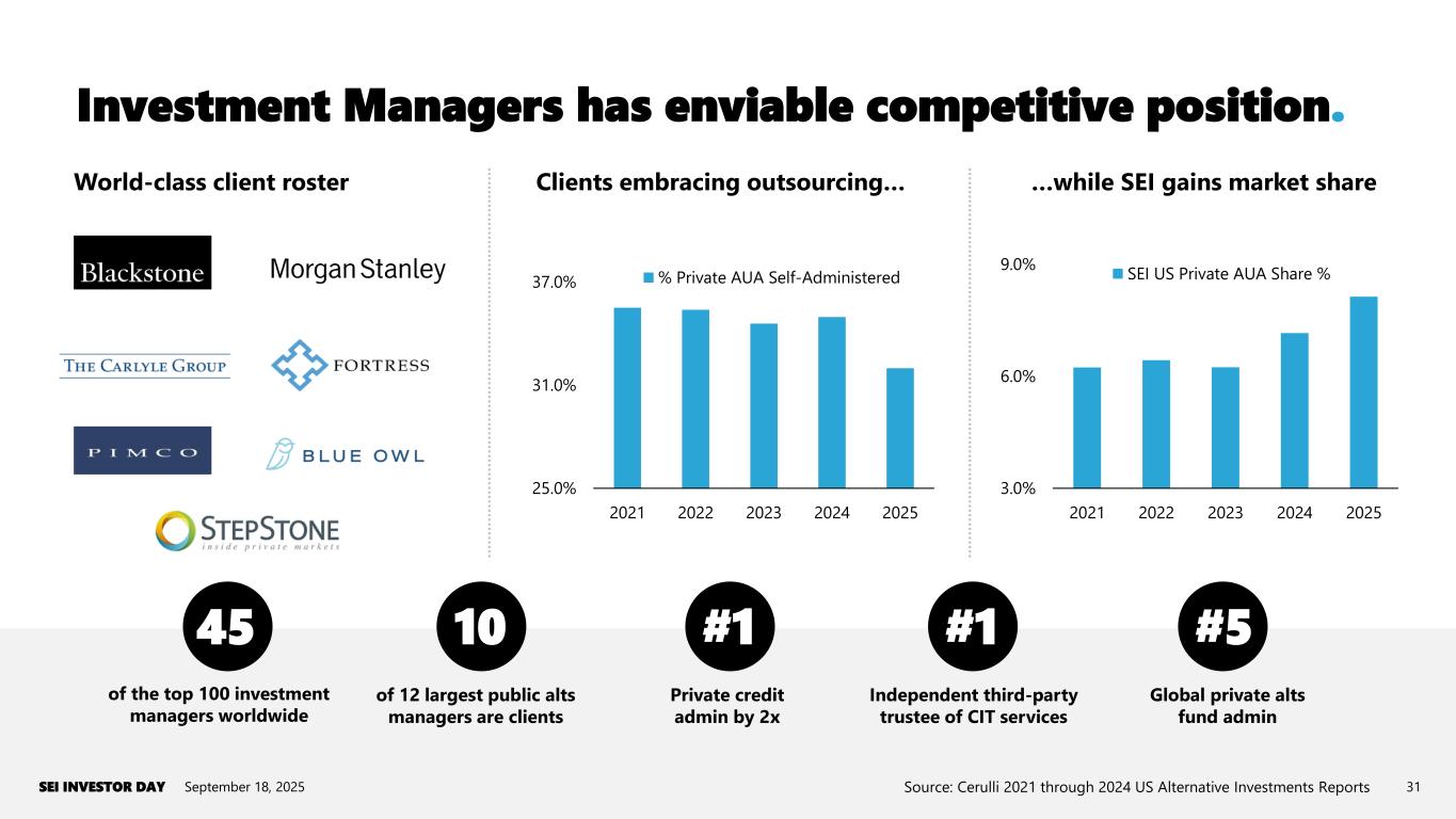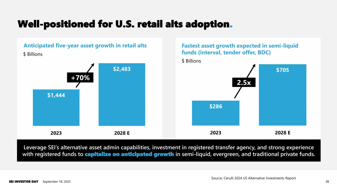 “Land and expand” example. September 18, 2025SEI INVESTOR DAY 36 US Private Credit EU Private Credit EU Real Estate US Private Equity Special Opportunities US Infrastructure US Real Estate EU Private Equity Digital Infrastructure APAC Private Credit APAC Private Equity APAC Direct Lending US Private Credit Real Estate Secondaries Special Opportunities BDC Private Equity Secondaries EU Private Credit Interval EU Private Equity Employee Co- Invests Private Credit Secondaries EU Real Estate US Direct Lending EU Direct Lending US Infrastructure US Real Estate US Private Equity Client AUA +290% SEI wallet share +100% SEI AUA +580% 2017 2025 SEI fund admin Third-party fund admin In-house fund admin Note: Illustrative data based on actual client examples.