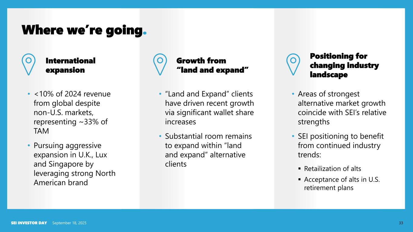 International expansion • <10% of 2024 revenue from global despite non-U.S. markets, representing ~33% of TAM • Pursuing aggressive expansion in U.K., Lux and Singapore by leveraging strong North American brand Growth from “land and expand” • Areas of strongest alternative market growth coincide with SEI’s relative strengths • SEI positioning to benefit from continued industry trends: ▪ Retailization of alts ▪ Acceptance of alts in U.S. retirement plans Positioning for changing industry landscape • “Land and Expand” clients have driven recent growth via significant wallet share increases • Substantial room remains to expand within “land and expand” alternative clients September 18, 2025SEI INVESTOR DAY 33 Where we’re going.