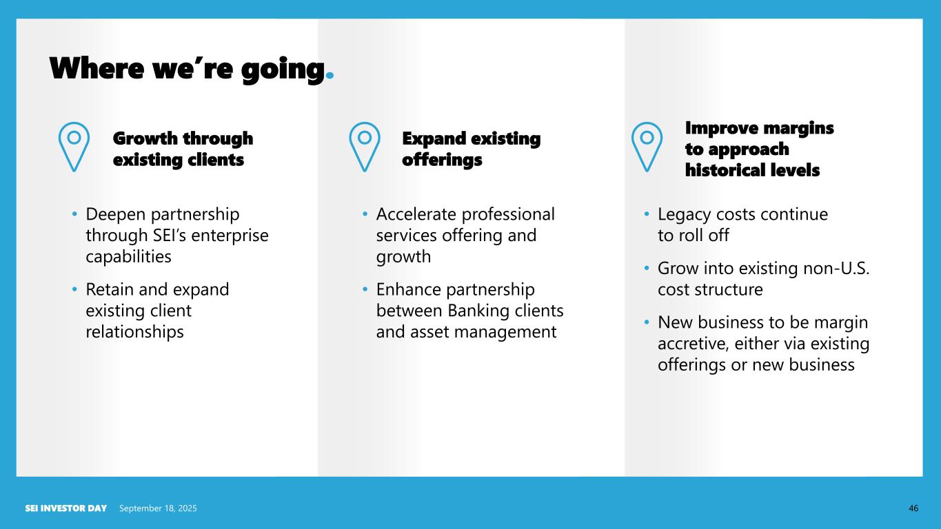 Growth through existing clients Expand existing offerings Improve margins to approach historical levels September 18, 2025SEI INVESTOR DAY 46 Where we’re going. • Deepen partnership through SEI’s enterprise capabilities • Retain and expand existing client relationships • Legacy costs continue to roll off • Grow into existing non-U.S. cost structure • New business to be margin accretive, either via existing offerings or new business • Accelerate professional services offering and growth • Enhance partnership between Banking clients and asset management