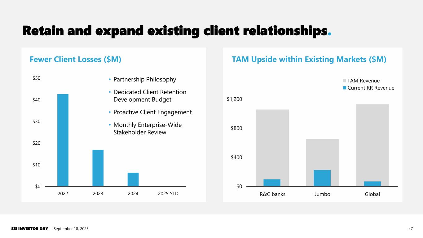 $0 $400 $800 $1,200 R&C banks Jumbo Global TAM Revenue Current RR Revenue Retain and expand existing client relationships. September 18, 2025SEI INVESTOR DAY 47 $0 $10 $20 $30 $40 $50 2022 2023 2024 2025 YTD TAM Upside within Existing Markets ($M)Fewer Client Losses ($M) • Partnership Philosophy • Dedicated Client Retention Development Budget • Proactive Client Engagement • Monthly Enterprise-Wide Stakeholder Review