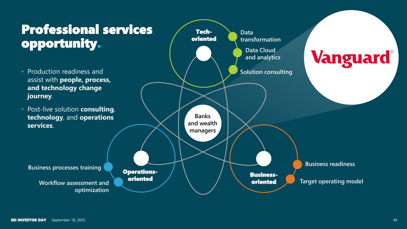 48 Professional services are expected to be approximately half of net events in 2025. R3I* Tech- oriented Operations- oriented Business- oriented Data conversion Outsourced CTO Data Cloud and analytics Operations automation Business process as a service Training as a service Target operating model Change management Banks and wealth managers September 18, 2025SEI INVESTOR DAY Professional services opportunity. Transformation assessment & business case for change *Retain, Retire, Replace, Integrate