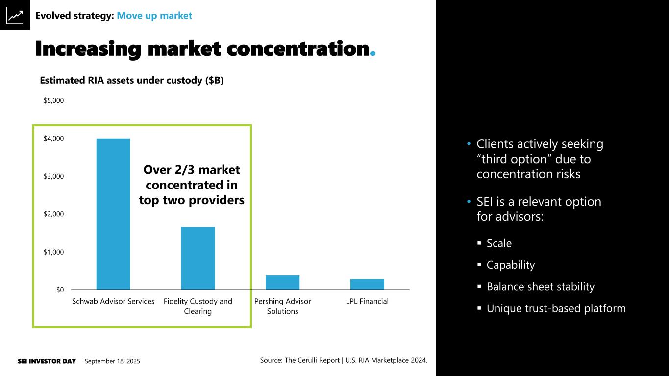 Price holistically. September 18, 2025SEI INVESTOR DAY 70 <$25M $50-$150M $150-$250M $250-$500M >$500M <$500k Higher average fees Missing $500k to $2M $2M to $10M >$10M Lower average fees Average client size Financial advisor total assets Evolved strategy: Move up market • Historical focus on smaller end of advisor and institutional market resulted in uncompetitive pricing at higher end of market • Low incremental costs allow for additional pricing flexibility to match (not beat) best-in-class competition • Focus with larger clients, even at lower fee rates, should enhance profitability. Small clients require significant overhead, offsetting high fee- rate benefit