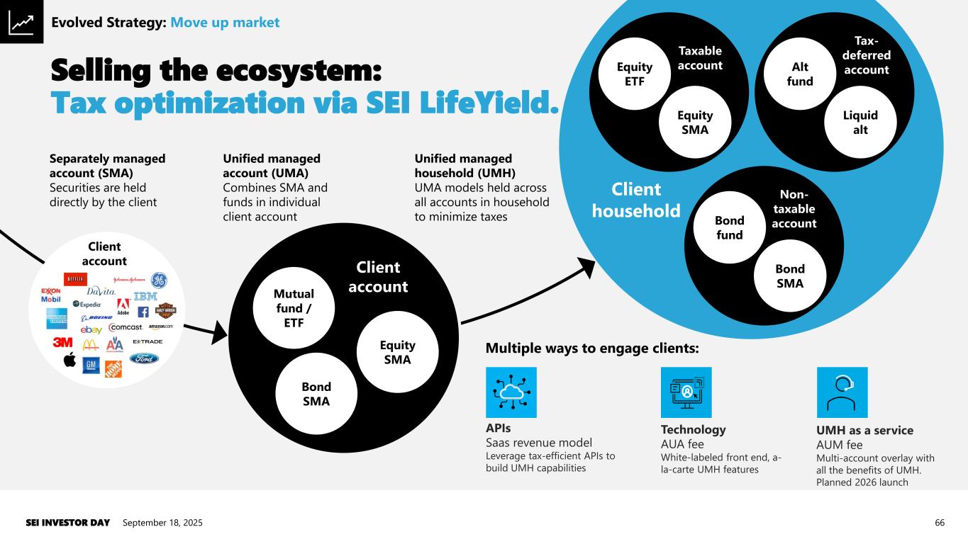 Selling the ecosystem: Tax optimization via SEI LifeYield. September 18, 2025SEI INVESTOR DAY 66 Client account Mutual fund / ETF Equity SMA Bond SMA Client account Client household Taxable accountEquity ETF Equity SMA Non- taxable accountBond fund Bond SMA Tax- deferred accountAlt fund Liquid alt Separately managed account (SMA) Securities are held directly by the client Unified managed account (UMA) Combines SMA and funds in individual client account Unified managed household (UMH) UMA models held across all accounts in household to minimize taxes Multiple ways to engage clients: APIs Saas revenue model Leverage tax-efficient APIs to build UMH capabilities Technology AUA fee White-labeled front end, a- la-carte UMH features UMH as a service AUM fee Multi-account overlay with all the benefits of UMH. Planned 2026 launch Evolved Strategy: Move up market