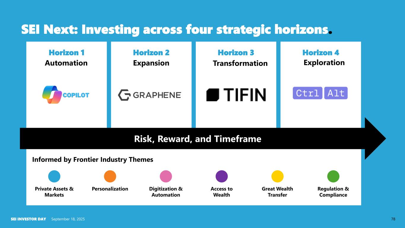 Private Assets & Markets Personalization Digitization & Automation Access to Wealth Great Wealth Transfer Regulation & Compliance Horizon 1 Horizon 2 Horizon 3 Horizon 4 Informed by Frontier Industry Themes Risk, Reward, and Timeframe September 18, 2025SEI INVESTOR DAY 78 SEI Next: Investing across four strategic horizons. Automation Expansion Transformation Exploration