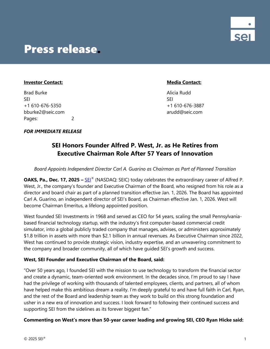 © 2025 SEI® 1 Investor Contact: Media Contact: Brad Burke Alicia Rudd SEI SEI +1 610-676-5350 +1 610-676-3887 bburke2@seic.com arudd@seic.com Pages: 2 FOR IMMEDIATE RELEASE SEI Honors Founder Alfred P. West, Jr. as He Retires from Executive Chairman Role After 57 Years of Innovation Board Appoints Independent Director Carl A. Guarino as Chairman as Part of Planned Transition OAKS, Pa., Dec. 17, 2025 – SEI® (NASDAQ: SEIC) today celebrates the extraordinary career of Alfred P. West, Jr., the company’s founder and Executive Chairman of the Board, who resigned from his role as a director and board chair as part of a planned transition effective Jan. 1, 2026. The Board has appointed Carl A. Guarino, an independent director of SEI’s Board, as Chairman effective Jan. 1, 2026. West will become Chairman Emeritus, a lifelong appointed position. West founded SEI Investments in 1968 and served as CEO for 54 years, scaling the small Pennsylvania- based financial technology startup, with the industry’s first computer-based commercial credit simulator, into a global publicly traded company that manages, advises, or administers approximately $1.8 trillion in assets with more than $2.1 billion in annual revenues. As Executive Chairman since 2022, West has continued to provide strategic vision, industry expertise, and an unwavering commitment to the company and broader community, all of which have guided SEI’s growth and success. West, SEI Founder and Executive Chairman of the Board, said: “Over 50 years ago, I founded SEI with the mission to use technology to transform the financial sector and create a dynamic, team-oriented work environment. In the decades since, I’m proud to say I have had the privilege of working with thousands of talented employees, clients, and partners, all of whom have helped make this ambitious dream a reality. I’m deeply grateful to and have full faith in Carl, Ryan, and the rest of the Board and leadership team as they work to build on this strong foundation and usher in a new era of innovation and success. I look forward to following their continued success and supporting SEI from the sidelines as its forever biggest fan.” Commenting on West’s more than 50-year career leading and growing SEI, CEO Ryan Hicke said: Press release.