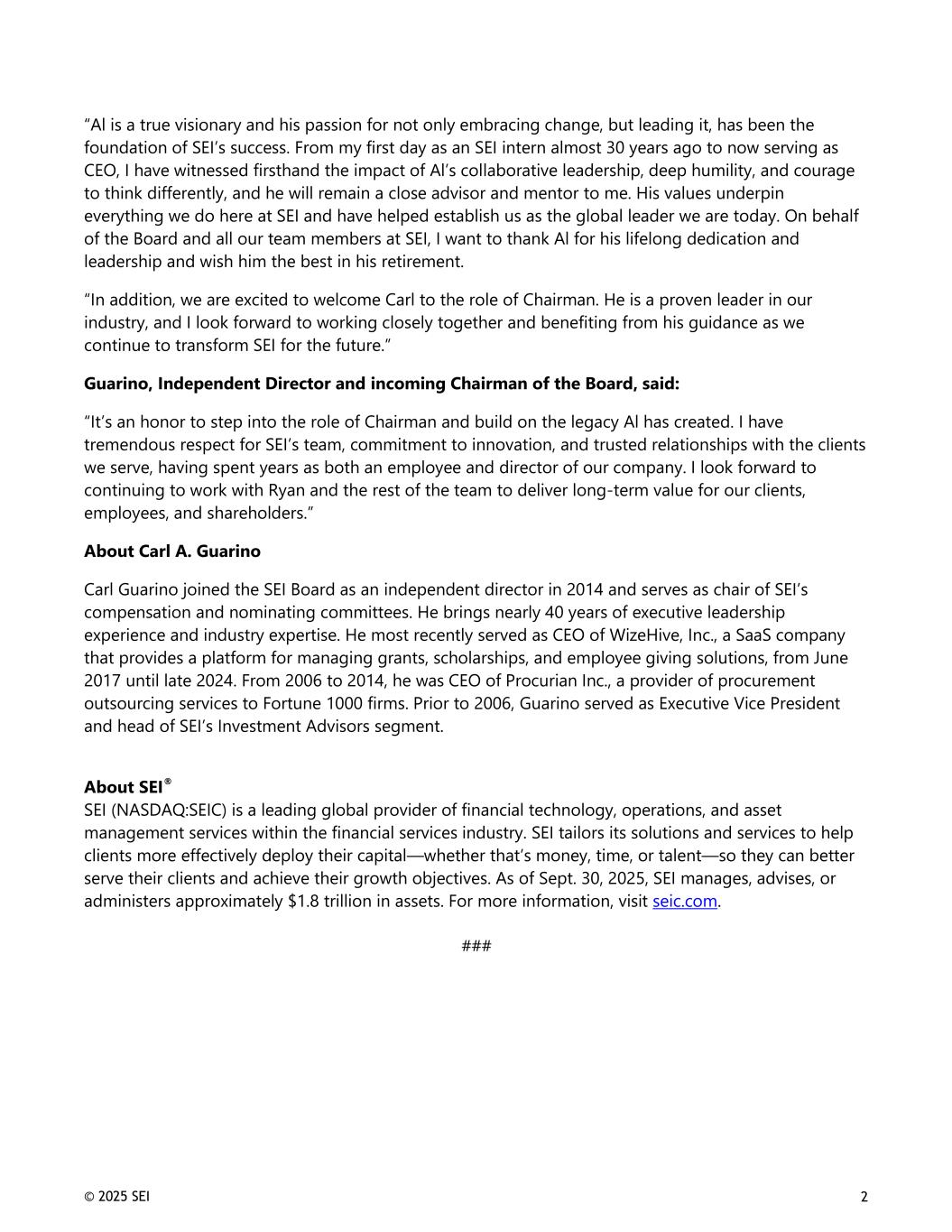 © 2025 SEI 2 “Al is a true visionary and his passion for not only embracing change, but leading it, has been the foundation of SEI’s success. From my first day as an SEI intern almost 30 years ago to now serving as CEO, I have witnessed firsthand the impact of Al’s collaborative leadership, deep humility, and courage to think differently, and he will remain a close advisor and mentor to me. His values underpin everything we do here at SEI and have helped establish us as the global leader we are today. On behalf of the Board and all our team members at SEI, I want to thank Al for his lifelong dedication and leadership and wish him the best in his retirement. “In addition, we are excited to welcome Carl to the role of Chairman. He is a proven leader in our industry, and I look forward to working closely together and benefiting from his guidance as we continue to transform SEI for the future.” Guarino, Independent Director and incoming Chairman of the Board, said: “It’s an honor to step into the role of Chairman and build on the legacy Al has created. I have tremendous respect for SEI’s team, commitment to innovation, and trusted relationships with the clients we serve, having spent years as both an employee and director of our company. I look forward to continuing to work with Ryan and the rest of the team to deliver long-term value for our clients, employees, and shareholders.” About Carl A. Guarino Carl Guarino joined the SEI Board as an independent director in 2014 and serves as chair of SEI’s compensation and nominating committees. He brings nearly 40 years of executive leadership experience and industry expertise. He most recently served as CEO of WizeHive, Inc., a SaaS company that provides a platform for managing grants, scholarships, and employee giving solutions, from June 2017 until late 2024. From 2006 to 2014, he was CEO of Procurian Inc., a provider of procurement outsourcing services to Fortune 1000 firms. Prior to 2006, Guarino served as Executive Vice President and head of SEI’s Investment Advisors segment. About SEI® SEI (NASDAQ:SEIC) is a leading global provider of financial technology, operations, and asset management services within the financial services industry. SEI tailors its solutions and services to help clients more effectively deploy their capital—whether that’s money, time, or talent—so they can better serve their clients and achieve their growth objectives. As of Sept. 30, 2025, SEI manages, advises, or administers approximately $1.8 trillion in assets. For more information, visit seic.com. ###