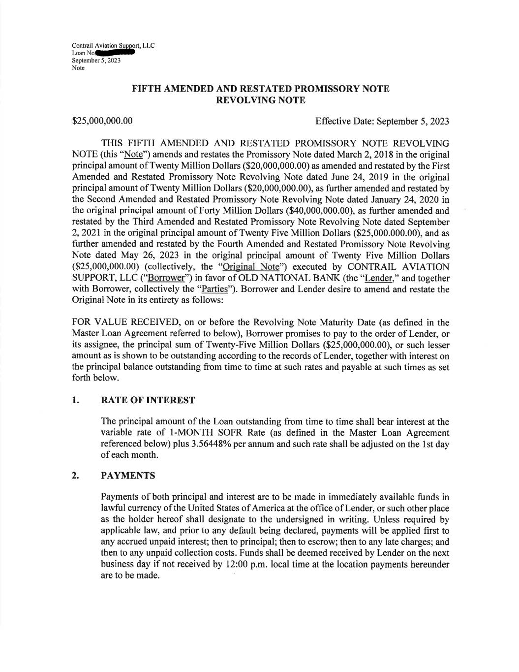 Contrail Aviation Support, LLC Loan No. 20007260597 September 5, 2023 Note FIFTH AMENDED AND RESTATED PROMISSORY NOTE REVOLVING NOTE $25,000,000.00 Effective Date: September 5, 2023 THIS FIFTH AMENDED AND RESTATED PROMISSORY NOTE REVOLVING NOTE (this “Note”) amends and restates the Promissory Note dated March 2, 2018 in the original principal amount of Twenty Million Dollars ($20,000,000.00) as amended and restated by the First Amended and Restated Promissory Note Revolving Note dated June 24, 2019 in the original principal amount of Twenty Million Dollars ($20,000,000.00), as further amended and restated by the Second Amended and Restated Promissory Note Revolving Note dated January 24, 2020 in the original principal amount of Forty Million Dollars ($40,000,000.00), as further amended and restated by the Third Amended and Restated Promissory Note Revolving Note dated September 2, 2021 in the original principal amount of Twenty Five Million Dollars ($25,000.000.00), and as further amended and restated by the Fourth Amended and Restated Promissory Note Revolving Note dated May 26, 2023 in the original principal amount of Twenty Five Million Dollars ($25,000,000.00) (collectively, the “Original Note”) executed by CONTRAIL AVIATION SUPPORT, LLC (“Borrower”) in favor of OLD NATIONAL BANK (the “Lender,” and together with Borrower, collectively the “Parties”). Borrower and Lender desire to amend and restate the Original Note in its entirety as follows: FOR VALUE RECEIVED, on or before the Revolving Note Maturity Date (as defined in the Master Loan Agreement referred to below), Borrower promises to pay to the order of Lender, or its assignee, the principal sum of Twenty-Five Million Dollars ($25,000,000.00), or such lesser amount as is shown to be outstanding according to the records of Lender, together with interest on the principal balance outstanding from time to time at such rates and payable at such times as set forth below. 1, RATE OF INTEREST The principal amount of the Loan outstanding from time to time shall bear interest at the variable rate of 1-MONTH SOFR Rate (as defined in the Master Loan Agreement referenced below) plus 3.56448% per annum and such rate shall be adjusted on the 1st day of each month. 2. PAYMENTS Payments of both principal and interest are to be made in immediately available funds in lawful currency of the United States of America at the office of Lender, or such other place as the holder hereof shall designate to the undersigned in writing. Unless required by applicable law, and prior to any default being declared, payments will be applied first to any accrued unpaid interest; then to principal; then to escrow; then to any late charges; and then to any unpaid collection costs. Funds shall be deemed received by Lender on the next business day if not received by 12:00 p.m. local time at the location payments hereunder are to be made.