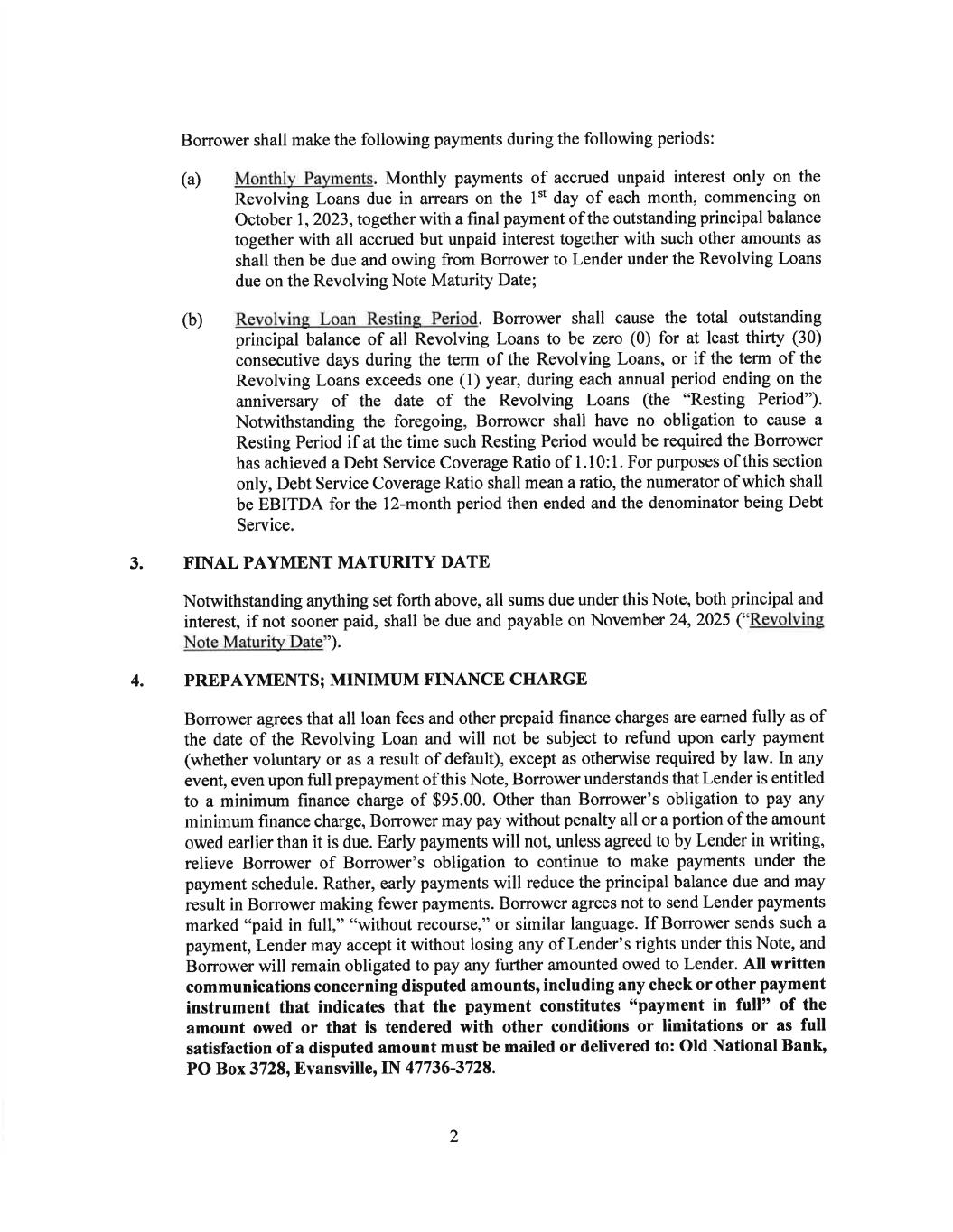 Borrower shall make the following payments during the following periods: (a) Monthly Payments. Monthly payments of accrued unpaid interest only on the Revolving Loans due in arrears on the 1 day of each month, commencing on October 1, 2023, together with a final payment of the outstanding principal balance together with all accrued but unpaid interest together with such other amounts as shall then be due and owing from Borrower to Lender under the Revolving Loans due on the Revolving Note Maturity Date; (b) Revolving Loan Resting Period. Borrower shall cause the total outstanding principal balance of all Revolving Loans to be zero (0) for at least thirty (30) consecutive days during the term of the Revolving Loans, or if the term of the Revolving Loans exceeds one (1) year, during each annual period ending on the anniversary of the date of the Revolving Loans (the “Resting Period”). Notwithstanding the foregoing, Borrower shall have no obligation to cause a Resting Period if at the time such Resting Period would be required the Borrower has achieved a Debt Service Coverage Ratio of 1.10:1. For purposes of this section only, Debt Service Coverage Ratio shall mean a ratio, the numerator of which shall be EBITDA for the 12-month period then ended and the denominator being Debt Service. FINAL PAYMENT MATURITY DATE Notwithstanding anything set forth above, all sums due under this Note, both principal and interest, if not sooner paid, shall be due and payable on November 24, 2025 (“Revolving Note Maturity Date”). PREPAYMENTS; MINIMUM FINANCE CHARGE Borrower agrees that all loan fees and other prepaid finance charges are earned fully as of the date of the Revolving Loan and will not be subject to refund upon early payment (whether voluntary or as a result of default), except as otherwise required by law. In any event, even upon full prepayment of this Note, Borrower understands that Lender is entitled to a minimum finance charge of $95.00. Other than Borrower’s obligation to pay any minimum finance charge, Borrower may pay without penalty all or a portion of the amount owed earlier than it is due. Early payments will not, unless agreed to by Lender in writing, relieve Borrower of Borrower’s obligation to continue to make payments under the payment schedule. Rather, early payments will reduce the principal balance due and may result in Borrower making fewer payments. Borrower agrees not to send Lender payments marked “paid in full,” “without recourse,” or similar language. If Borrower sends such a payment, Lender may accept it without losing any of Lender’s rights under this Note, and Borrower will remain obligated to pay any further amounted owed to Lender. All written communications concerning disputed amounts, including any check or other payment instrument that indicates that the payment constitutes “payment in full” of the amount owed or that is tendered with other conditions or limitations or as full satisfaction of a disputed amount must be mailed or delivered to: Old National Bank, PO Box 3728, Evansville, IN 47736-3728.